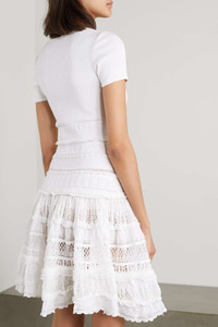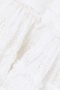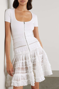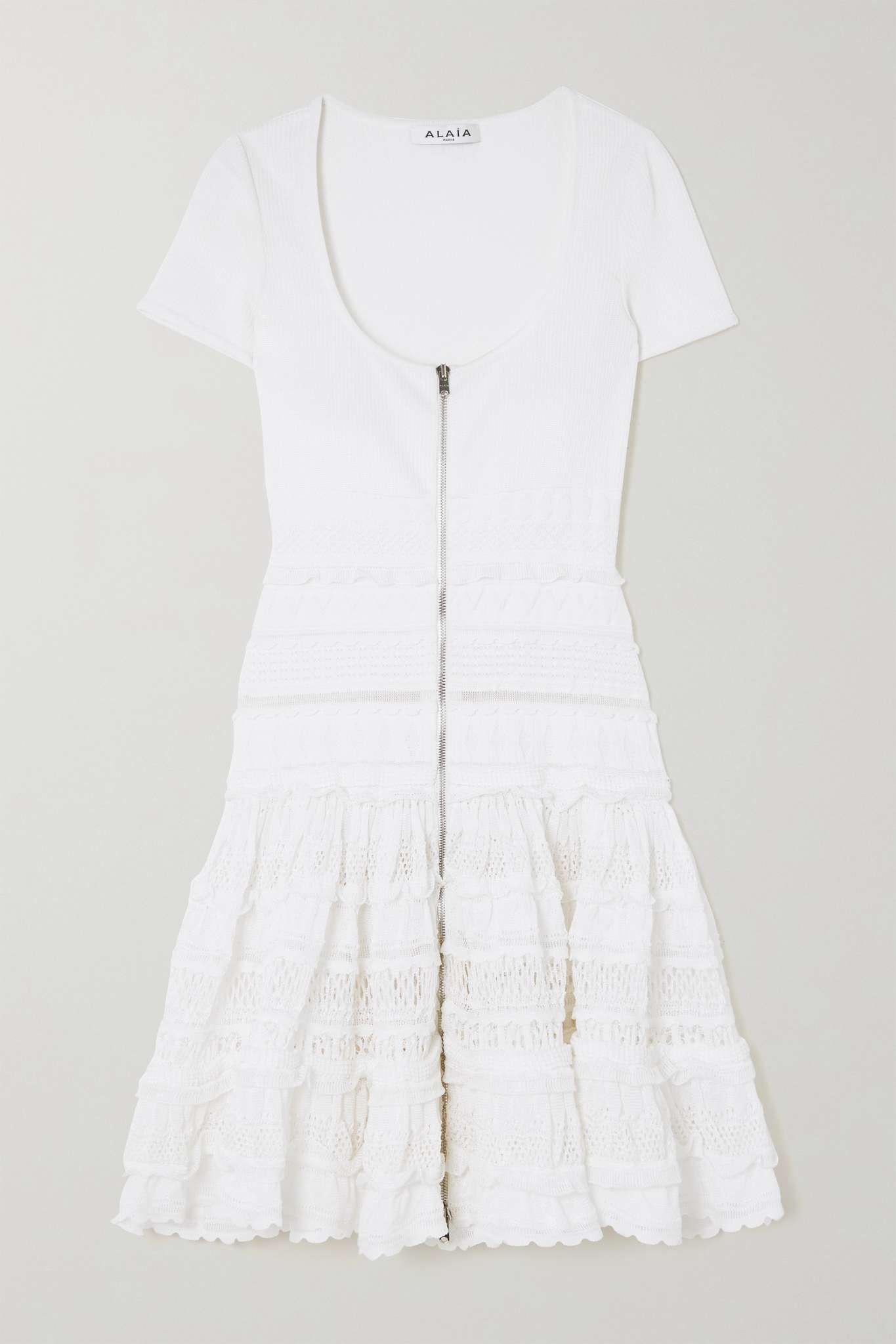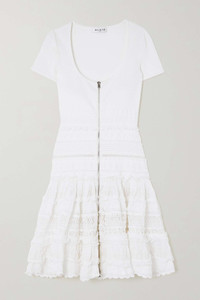 EDITORS'NOTES Alaïa's dress nods to the brand's skater styles that debuted in 2007. Made from crochet-knit, it has a low scoop neck and slim-fitting bodice that kicks out to a flowy skirt just below the hips. The soft ruffles add to its feminine feel. SIZE & FIT - Fits true to size, take your normal size - Designed to be fitted at the bust and waist, slightly loose at the hip - Mid-weight knit - Model is 175cm/ 5'9" and is wearing a FR 36 DETAILS & CARE - White crochet-knit - Two-way zip fastening through front - 83% viscose, 13% polyester, 3% polyamide, 1% elastane; trim: 78% viscose, 15% polyester, 5% polyamide, 2% elastane - Designer color: Optic White