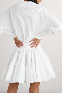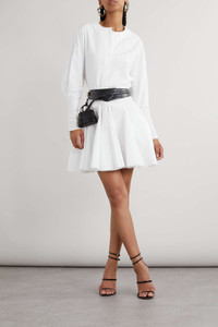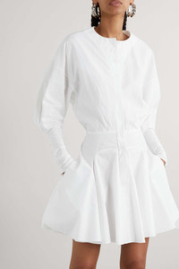 EDITORS'NOTES Alaïa's flare for proportions makes classic pieces like this mini shirt dress feel so unique. It's made from breezy cotton-poplin with a fitted waistline and artfully gathered pleats, which flare out to a mini hem that's tiered at the back. Wear it with strappy sandals on spring walks. SIZE & FIT - Fits true to size, take your normal size - Designed to be fitted at the waist, loose at bust and the hip - Lightweight, non-stretchy fabric - Model is 177cm/ 5'10" and is wearing a FR 36 DETAILS & CARE - White cotton-poplin - Partially concealed button fastenings through front - 100% cotton