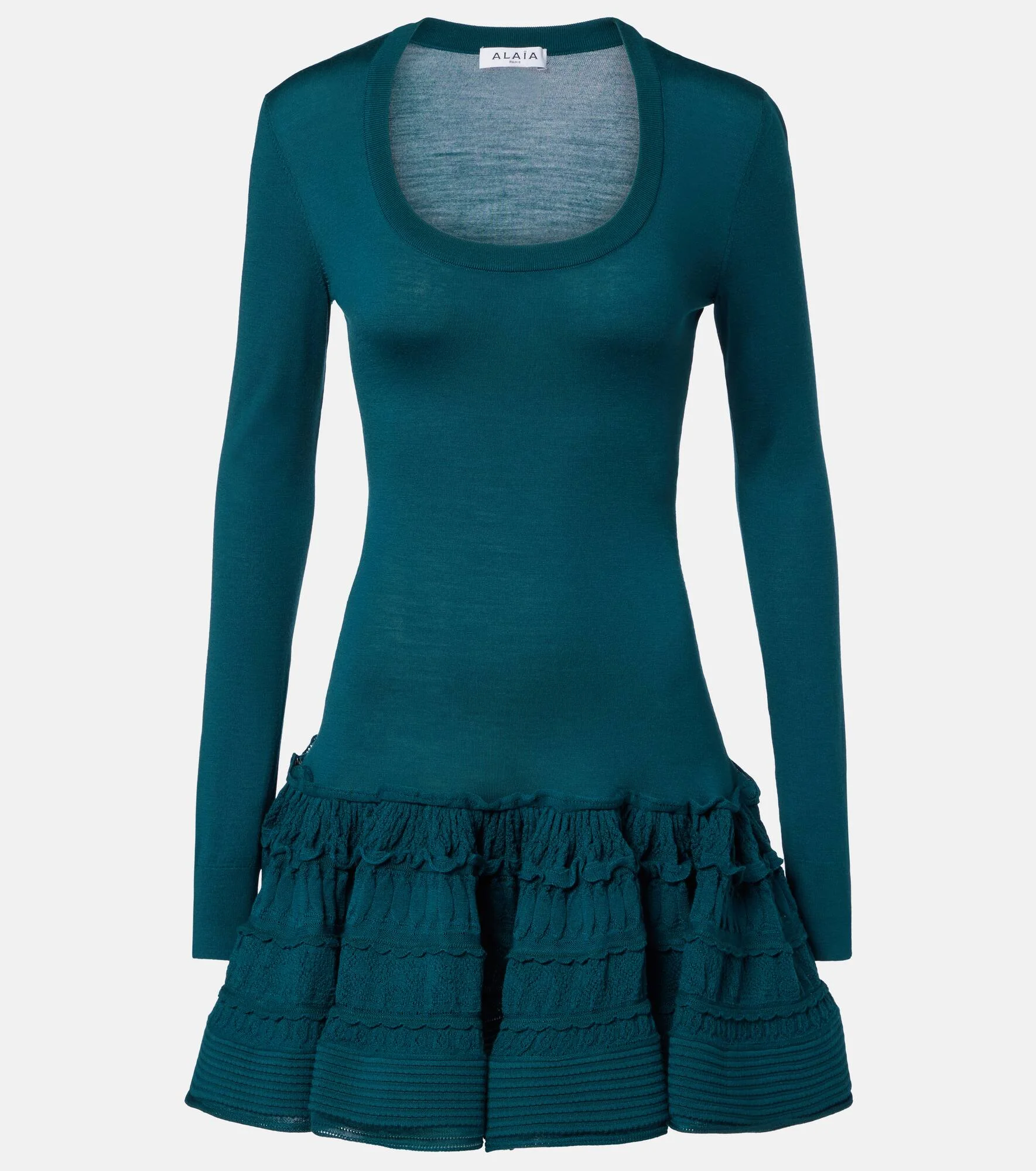 Upholding the legacy of Azzedine Alaia, the maison’s collections achieve an artful balance between sculptural and wearable. This tiered minidress is knitted from a fine wool blend and shaped into a crinoline-inspired, ruffled silhouette. Product Details - Material: 97% wool, 2% polyamide, 1% elastane - Care instructions: dry clean - Made in Italy - Color: green - Designer color name: Vert Petrole - Material II: 92% wool, 6% polyamide, 2% elastane - Details: 88% wool, 9% polyamide, 3% elastane - Item number: P01112235 Size & Fit - True to size - Fitted - Stretchy fabric - The model seen in the picture is 178cm-5'10" and wearing a size FR 34