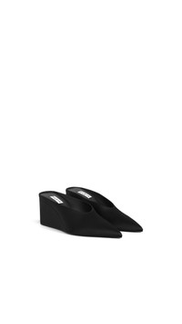 DETAILS Wedge mules with cubic heel 75 mm heel Pointed toe Satin fabric Made in Italy MATERIALS Highlights MAIN LINING: 100% LAMBSKIN LEATHER SOLE: 80% CALFSKIN LEATHER, 20% RUBBER UPPER MATERIAL 1: 72% VISCOSE, 28% SILK PRODUCT REFERENCE: AA3M104A024-999