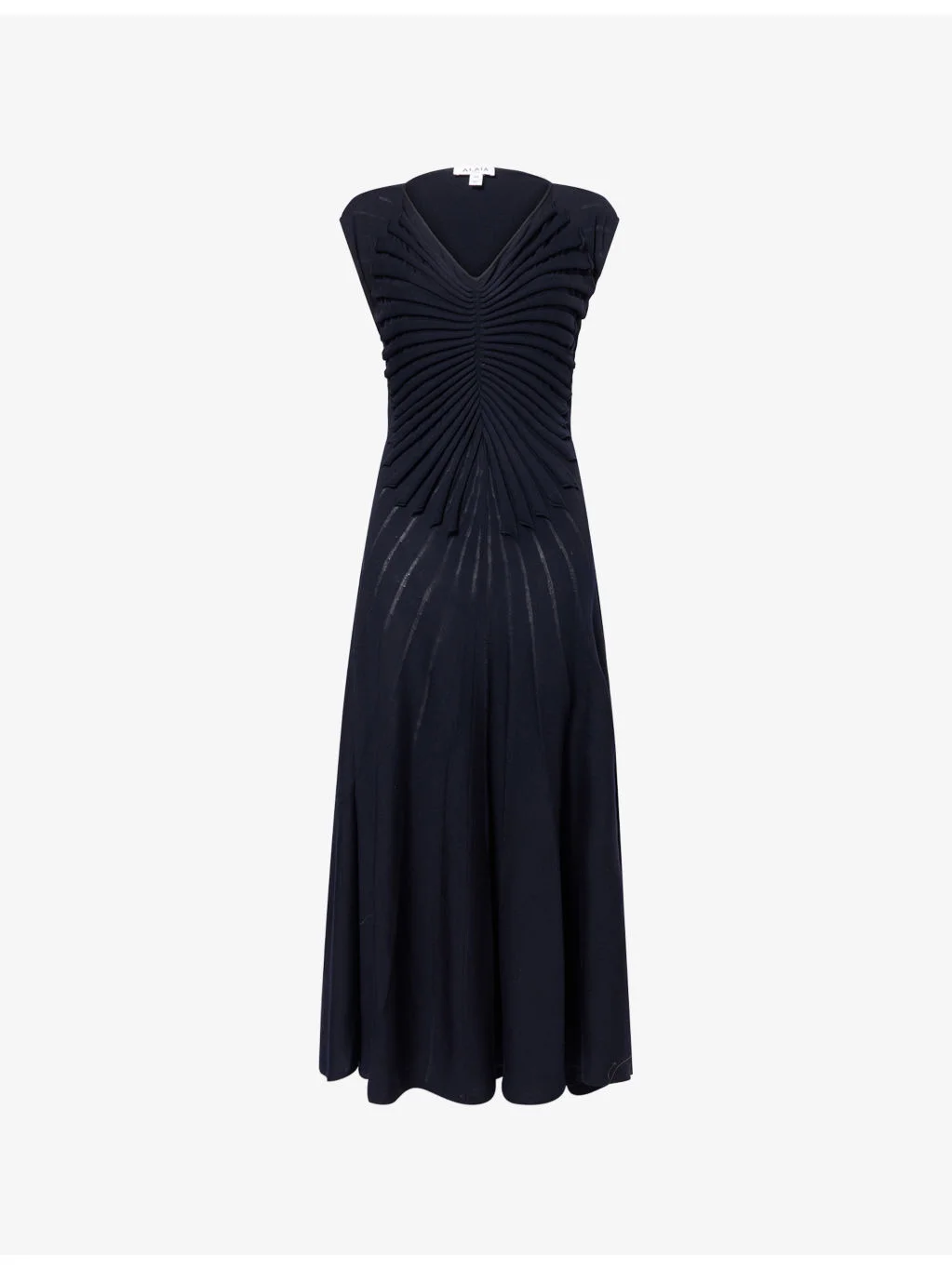 PRODUCT DETAILS - Alaia wool midi dress - 100% virgin wool; trims 86% wool, 13% polyamide, 1% elastane - Slim fit, high neck, sleeveless, asymmetric hem, ribbed design, midi length - Dry clean - Made in Italy - True to size - Size UK 8: length 53in / 134.5cm - Model is 5ft 10in/1.78m and wears a size UK 8 - Midweight, stretchy Ref: R04558213