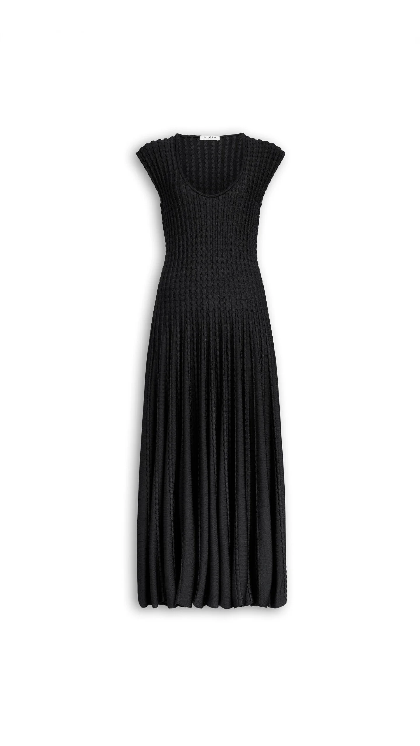 DETAILS Flare dress knitted in sculptural pleats Scoop neckline, cap sleeves Bead knit detailling Midi length Fit & Flare Made in Italy MATERIALS MAIN MATERIAL: 86% VISCOSE, 7% POLYAMIDE, 6% POLYPROPYLEN, 1% POLYURETHANE RIBBING: 75% VISCOSE, 13% POLYAMIDE, 11% POLYPROPYLEN, 1% POLYURETHANE PRODUCT REFERENCE: AA9R3055K195C-995