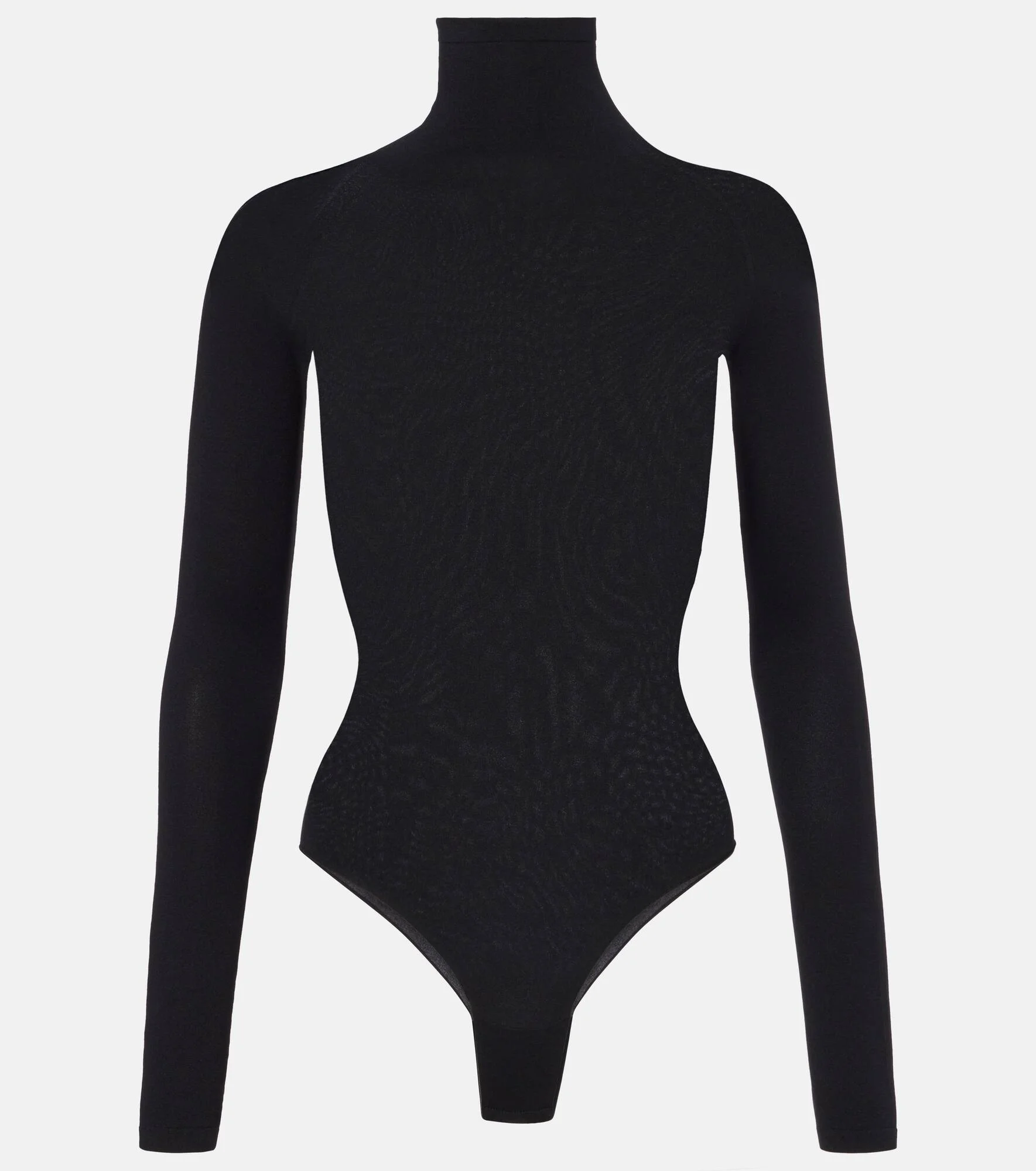 Made in Italy from a second-skin fabric, this bodysuit from Alaia is designed with a flattering silhouette. Perfect for a layered ensemble, the piece features snap-button fastening for easy closure and a turtleneck. Product Details - Material: 75% polyamide, 25% elastane - Care instructions: specialist clean - Made in Italy - Designer color name: Noir Alaia - Item color: black - Collar: turtleneck - Closure: snap-buttoned fastenings - Item number: P01085084 Size & Fit - True to size - Fitted - Stretchy fabric - High-cut leg - The model seen in the picture is 178cm-5'10" and wearing a size FR 34