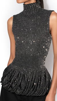 DETAILS Fitted top in sequin knit Funnel neck, sleeveless Loop hemline Made in Italy MATERIALS Highlights MAIN MATERIAL: 55% POLYAMIDE, 44% POLYESTER, 1% VISCOSE PRODUCT REFERENCE: AA9H1390K149C-995