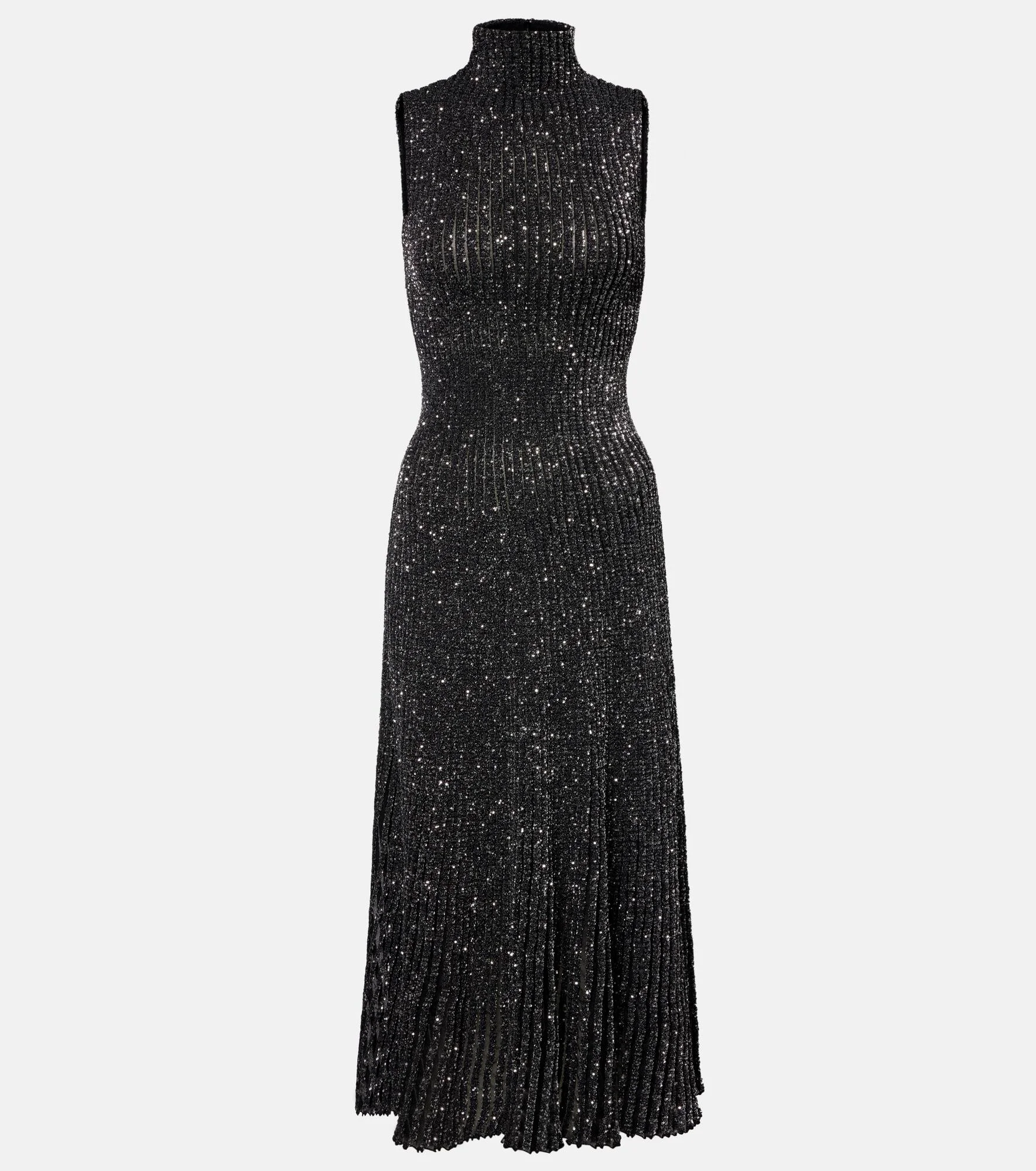 Upholding the legacy of Azzedine Alaia, the maison’s designs achieve an artful balance between sculptural and wearable. This midi dress boasts a fitted silhouette with a mock neckline and shimmering all-over sequins. Product Details - Material: 55% polyamide, 45% polyester - Care instructions: dry clean - Made in Italy - Color: black - Designer color name: Noir Alaia - Closure: concealed zipped back - Collar: mockneck - Item number: P01112237 Size & Fit - True to size - Fitted - Stretchy fabric - The model seen in the picture is 178cm-5'10" and wearing a size FR 34