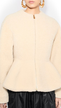 DETAILS Round collar peplum jacket in shearling Cinched fit and ruffle hem Gold hardware zip Made in France MATERIALS Highlights MAIN MATERIAL: 100% LAMBSKIN LEATHER POCKET LINING: 100% COTTON LINING: 100% POLYAMIDE PRODUCT REFERENCE: AA9V1230L033C-113