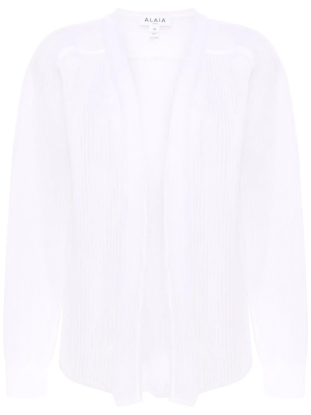 sheer stripe cardigan Highlights - White - Semi-sheer construction - Vertical stripe pattern - Raw edge - Long sleeves - Ribbed cuffs Made in Italy Composition Polyimide 61%, Silk 39% SIZE & FIT Model measurements Height 5 ft 11 in(1.8 m) Bust/Chest 31.1 in(79 cm) Hips 36.22 in(92 cm) Waist 25.98 in(66 cm) FittingInformation Designed to be unstructured, offering a loose fit throughout Made with a midweight knit, this piece offers some stretch This piece fits true to size – take your usual size Washing instructions Dry Clean Only
