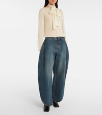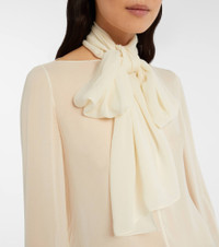 Honoring Azzedine Alaia’s legacy, the maison’s sculptural yet wearable collections hold an artful balance that only the most skilled designers can achieve. Made from semi-sheer material, this blouse is sophistication personified with its self-tie neckline. Product Details - Material: 100% viscose - Care instructions: dry clean - Made in Italy - Designer color name: Ivoire - Item color: white - Closure: buttoned front - Self-tie neck - Item number: P01085223 Size & Fit - True to size - Sheer - Straight fit - Non-stretchy fabric - Falls below the hip - The model seen in the picture is 178cm-5'10" and wearing a size FR 34