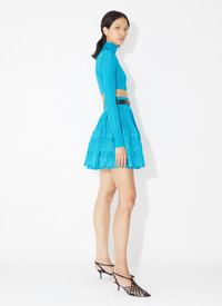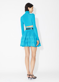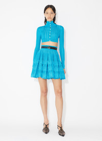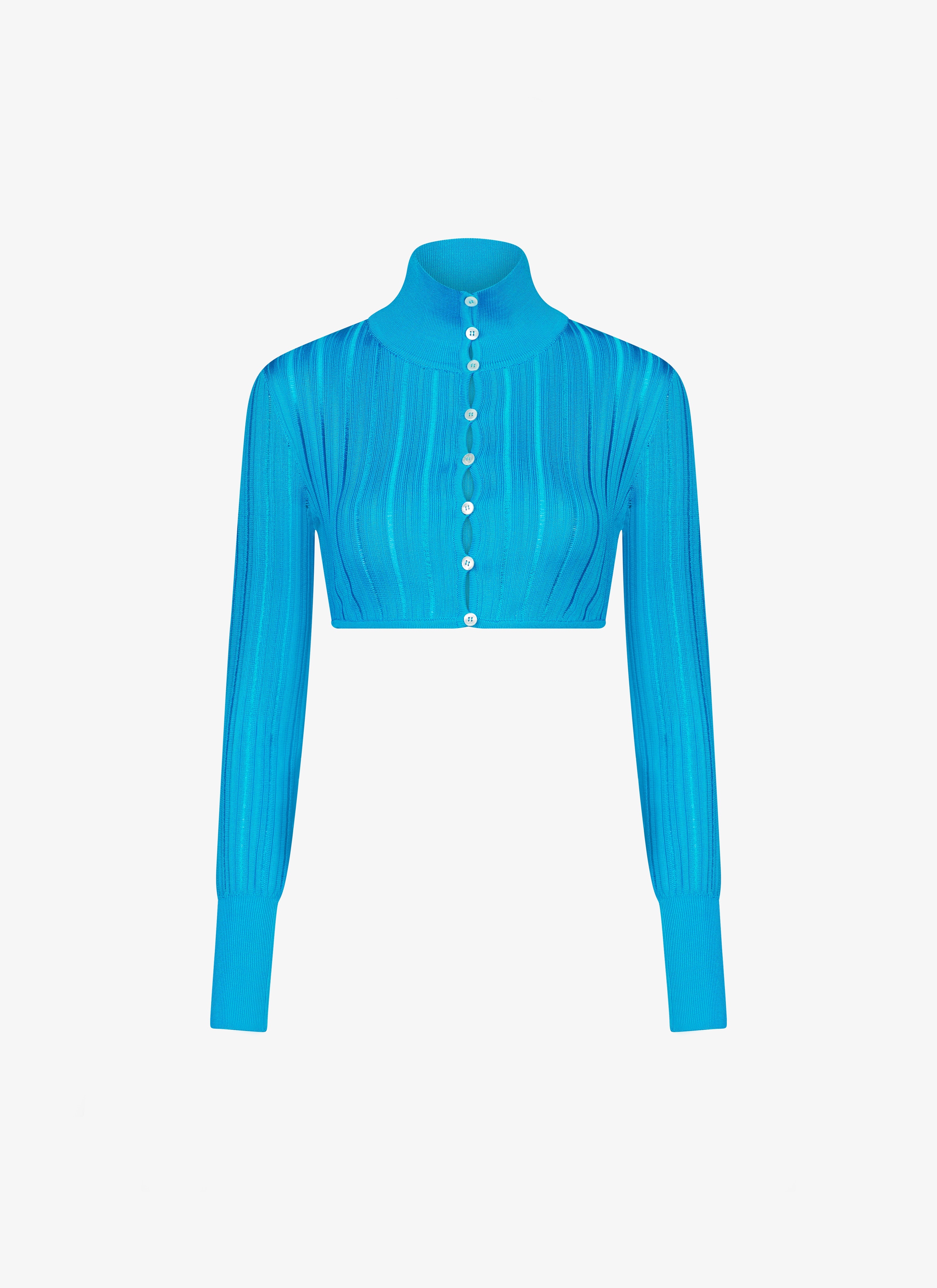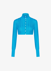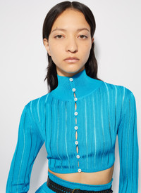 crinoline cardigan cropped with a curved hem features a high neck and loop button holes features fine ladder stitch knitted in high shine fluid viscose made in italy DETAILS COMPOSITION: 97% VISCOSE ADDITIONAL MATERIAL: 2% POLYAMIDE, 1% POLYURETHANE, 95% VISCOSE, 4% POLYAMIDE, 1% POLYURETHANE THE MODEL MEASURES 1m78 AND WEARS A SIZE 34 PRODUCT REFERENCE: AA9S02234M712 - 556