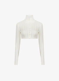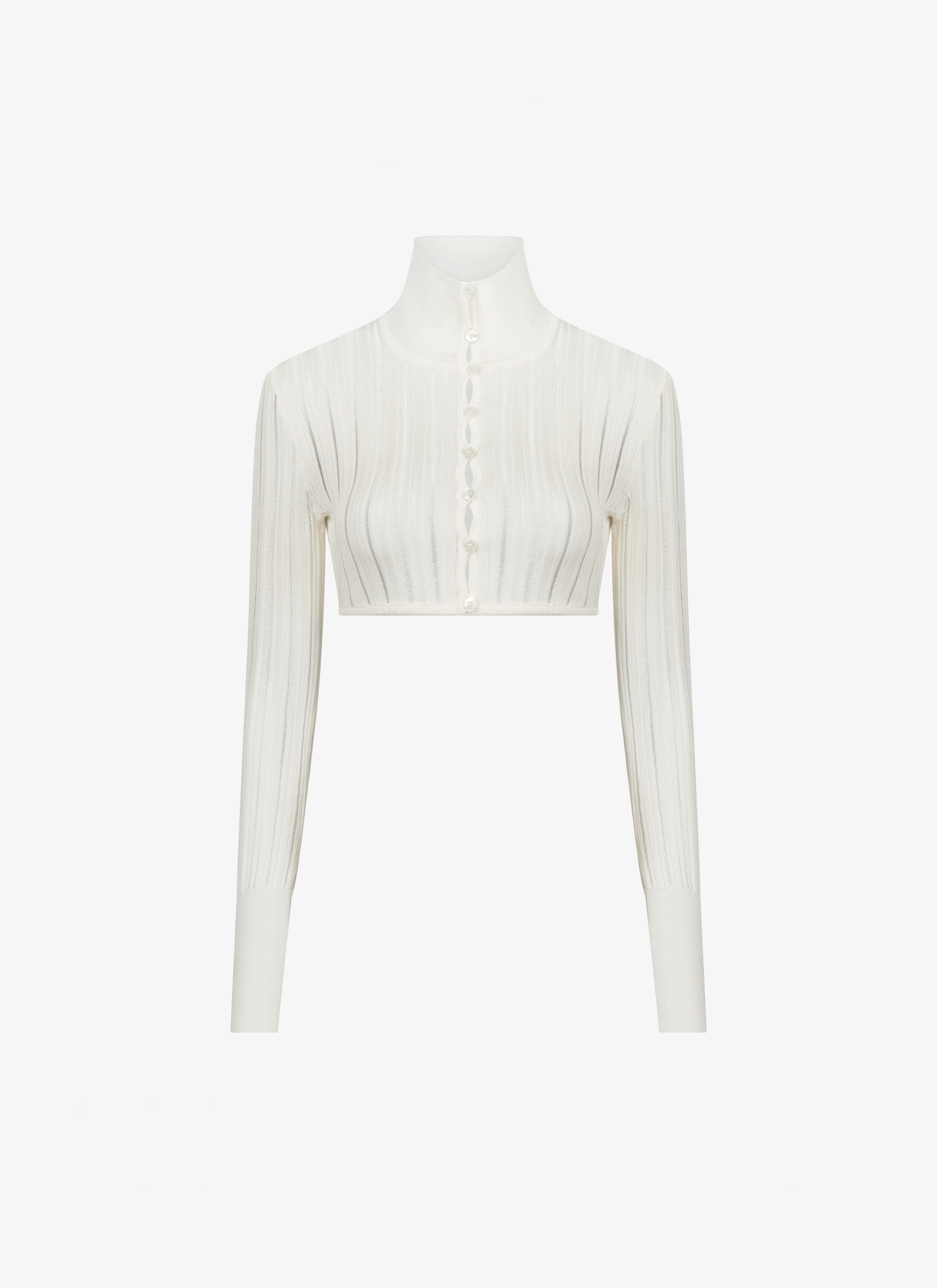 crinoline cardigan cropped with a curved hem features a high neck and loop button holes features fine ladder stitch knitted in high shine fluid viscose made in italy DETAILS COMPOSITION: 97% VISCOSE ADDITIONAL MATERIAL: 2% POLYAMIDE, 1% POLYURETHANE, 95% VISCOSE, 4% POLYAMIDE, 1% POLYURETHANE PRODUCT REFERENCE: AA9S02234M712 - 113