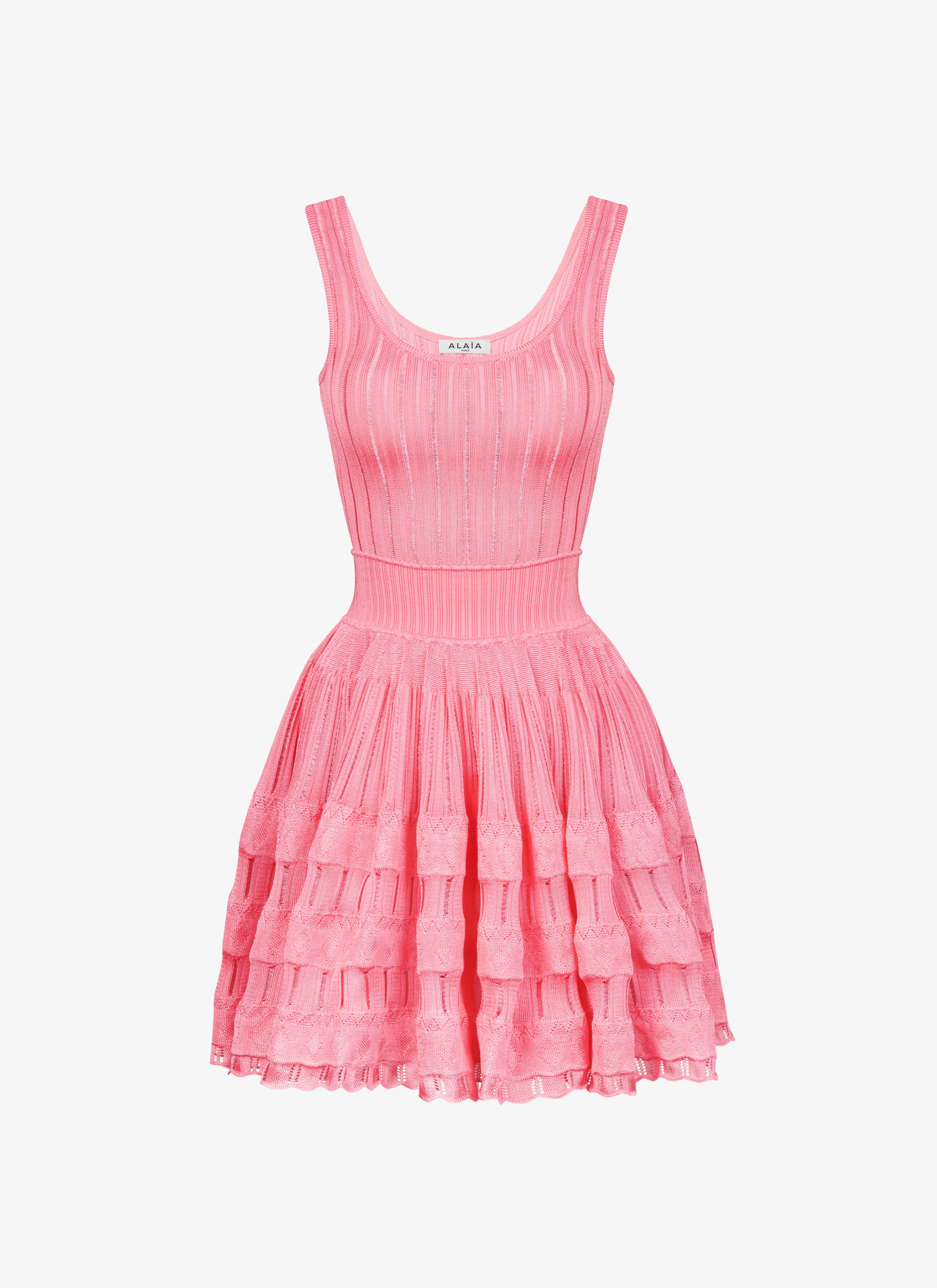 crinoline skater dress sleeveless and scoop neck volume exploding from the waist created by exclusive alaïa technique bodice of dress in fine ladder stitch knitted in a high shine fluid viscose made in italy DETAILS COMPOSITION: 97% VISCOSE ADDITIONAL MATERIAL: 2% POLYAMIDE, 1% ELASTANE SKIRT: 100% VISCOSE WAISTBAND: 89% VISCOSE, 7% POLYAMIDE, 4% ELASTANE MESH: 61% VISCOSE, 34% POLYAMIDE, 5% ELASTANE PRODUCT REFERENCE: AA9R22462M712 - 489