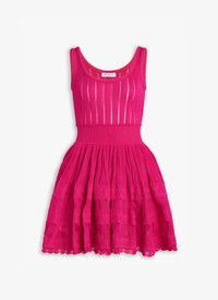 crinoline skater dress sleeveless, scoop neck volume exploding from the waist created by exclusive alaïa technique mimicking the effect of a traditional crinoline ribbon bodice of dress in fine ladder stitch knitted in a high shine fluid viscose made in italy DETAILS COMPOSITION: 78% VISCOSE, 14% POLYESTER, 6% POLYAMIDE, 1% ELASTANE, 1% POLYURETHANE EDGE: 71% VISCOSE, 15% POLYESTER, 11% POLYAMIDE, 3% ELASTANE PRODUCT REFERENCE: AA9R22462M712 - 446