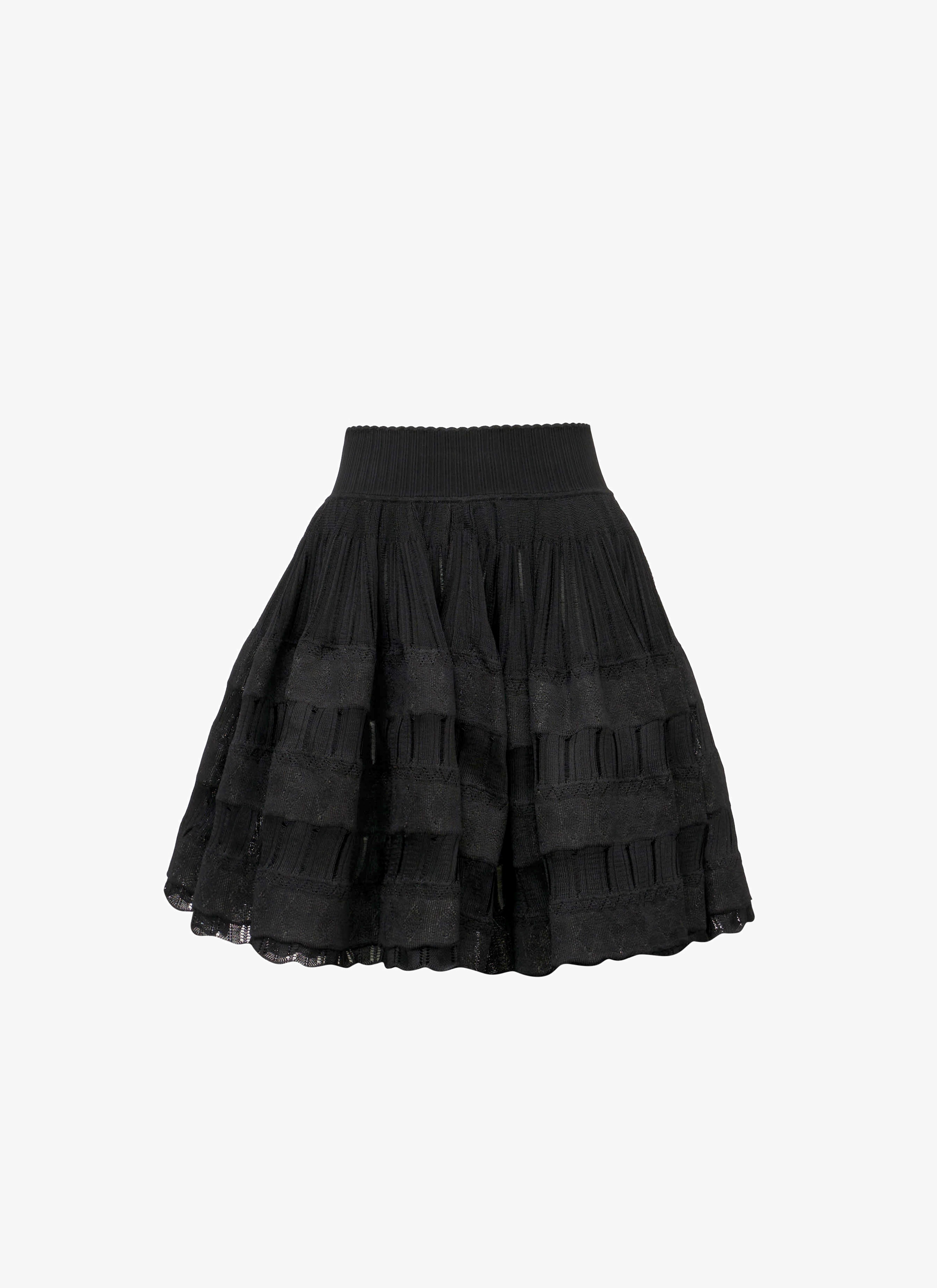 High-waisted mini-skirt; ribbed waist exploding into a full volume skirt; knitted in high shine viscose lace stitches. Made in Italy DETAILS COMPOSITION: 84% VISCOSE, 14% POLYAMIDE, 2% ELASTHANNE PRODUCT REFERENCE: AA9J21162M712 - 995