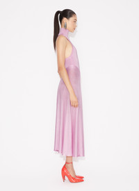 sleeveless midi dress fitted body and flared skirt straps cross at the back made from shiny viscose made in italy DETAILS COMPOSITION: 88% VISCOSE, 11% POLYAMIDE, 1% POLYURETHANE PRODUCT REFERENCE: AA9R24135M858 - 471
