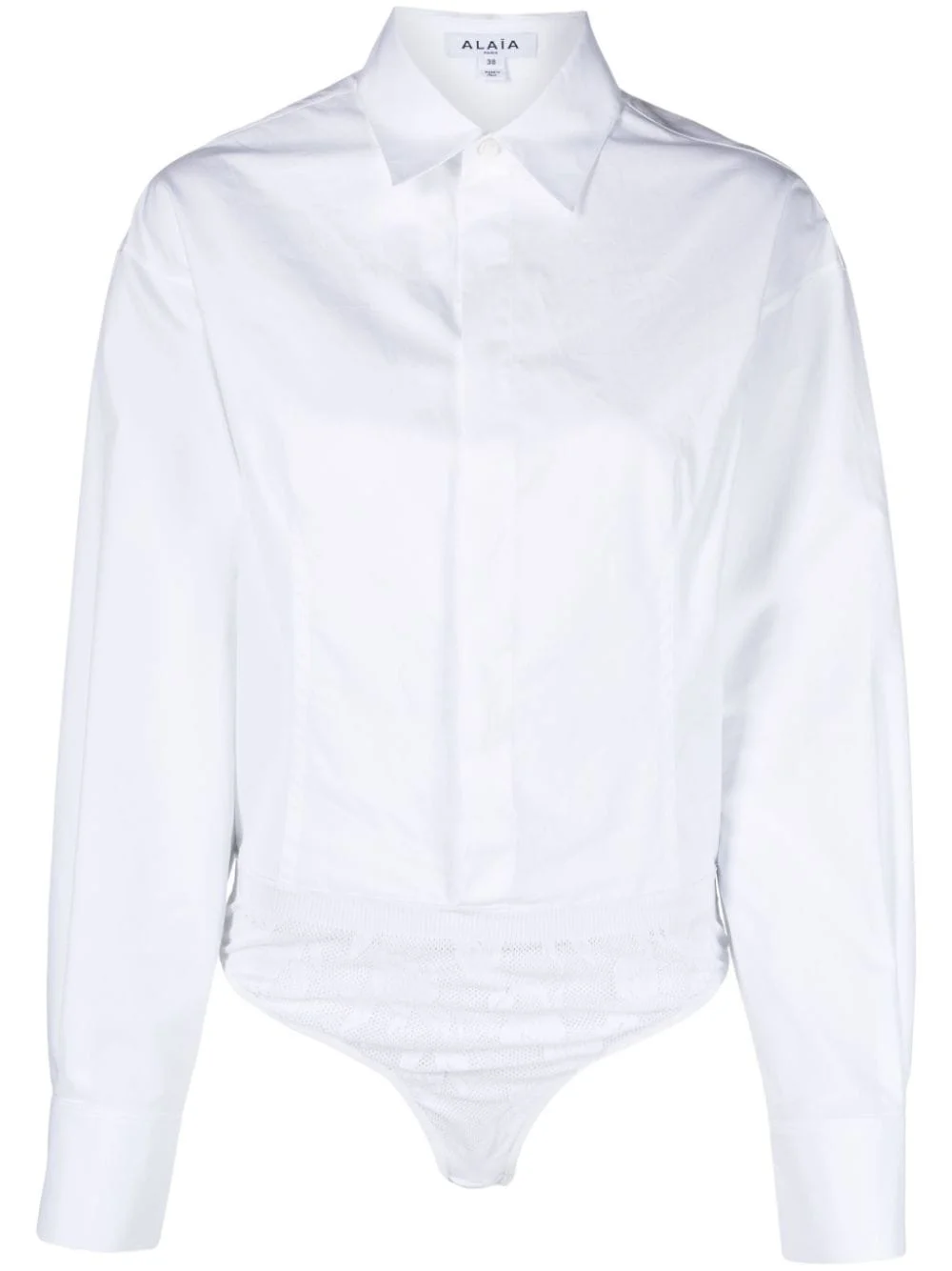 pointed-collar poplin bodysuit Highlights - White - Stretch-cotton - Poplin texture - Mesh panelling - Dart detailing - Pointed flat collar - Concealed front button fastening - Concealed press-stud fastening - Drop shoulder - Long sleeves - Buttoned cuffs - Elasticated band - High cut - Just a reminder that this piece must be tried on over your own garments. Made in Italy Composition Cotton 100%, Nylon 83%, Spandex/Elastane 17% SIZE & FIT Model measurements Height 5 ft 10 in(1.77 m) Bust/Chest 29.92 in(76 cm) Hips 34.25 in(87 cm) Waist 23.62 in(60 cm) FittingInformation Designed for a loose fit at the chest and waist with a close fit at the hips Made from a midweight non-stretch fabric This piece fits true to size – take your usual size Washing instructions Dry Clean Only