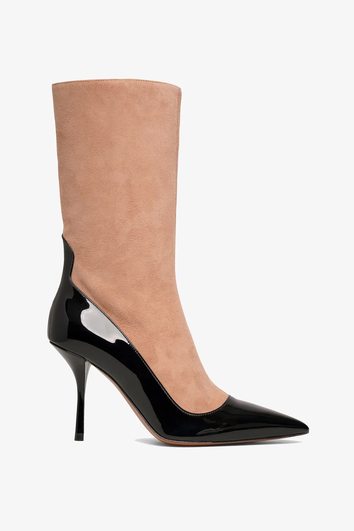 Black and beige boots from Alaia. The Short Boots are made of suede and patent leather featuring a flattering front cut, inside zip along with a lightly cushioned insole. It is mounted on a slim stiletto heel measuring 90mm. - True to size - Leather sole - Made in Italy Product Code: AA3B063CK152119