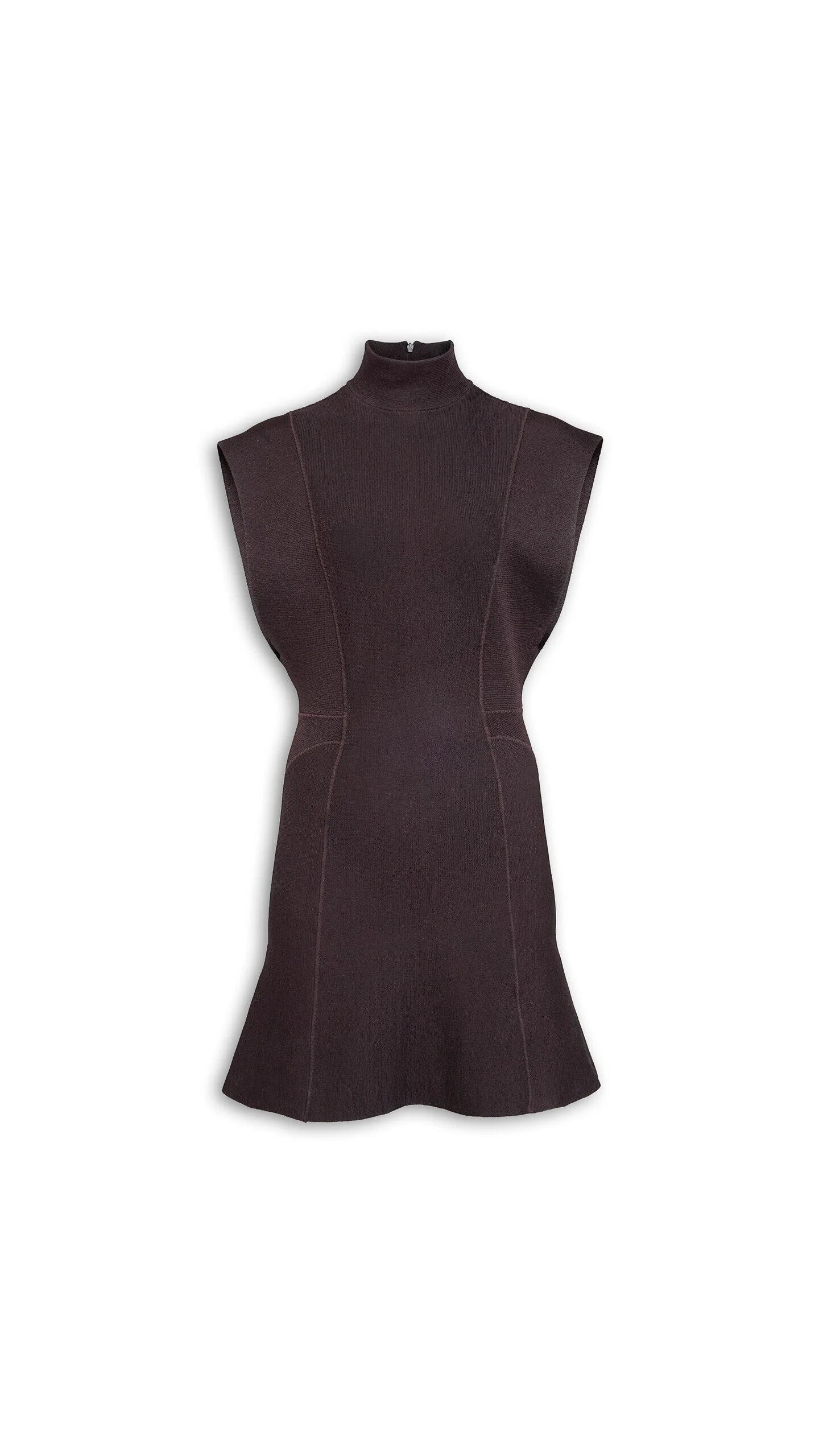 DETAILS Short dress knitted in silk viscose High neck with invisible closure at the back, cap sleeves, ruffle hemline Mini length Cinched fit Made in Italy MATERIALS MAIN MATERIAL: 53% VISCOSE, 32% SILK, 11% POLYESTER, 3% POLYAMIDE, 1% ELASTANE PRODUCT REFERENCE: AA9R2939K193C-413