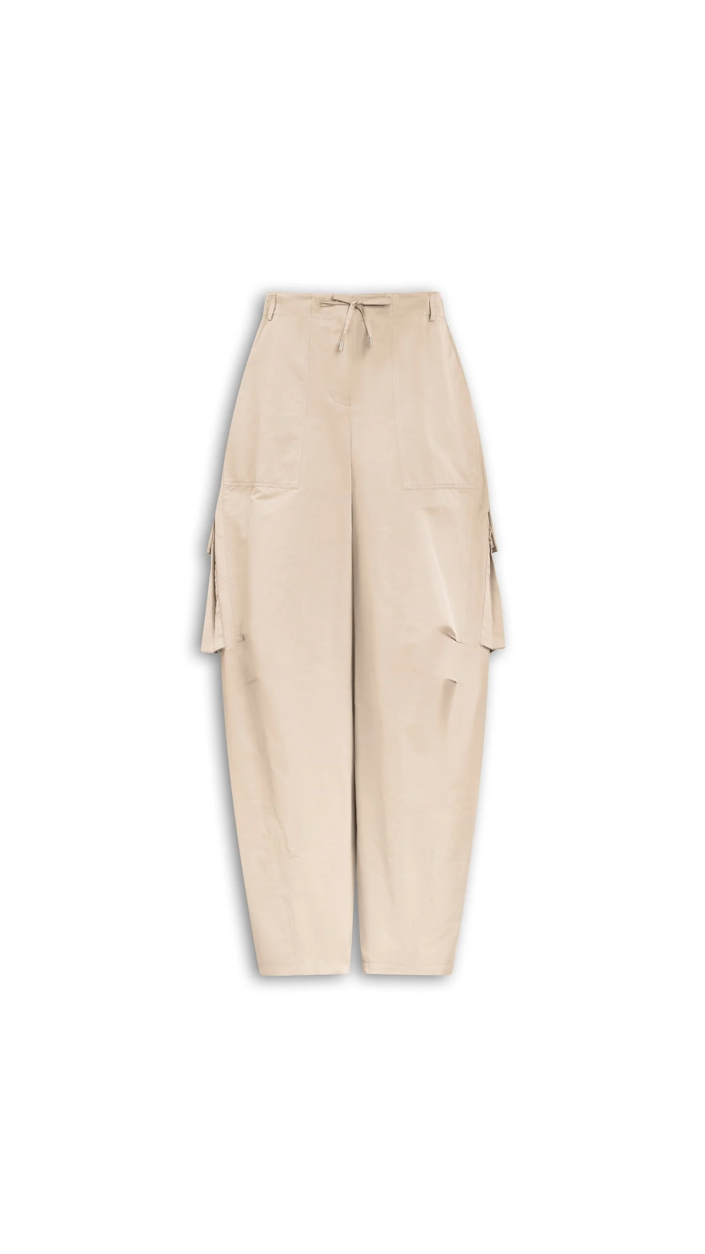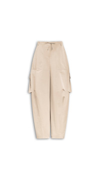 DETAILS Cargo pants in radzimir Barrel leg, low waist with zip fly and drawstrings Side seam pockets, welt back pockets and side cargo pockets with flaps Twisted topstitchings Made in Italy MATERIALS Highlights MAIN MATERIAL: 70% POLYESTER, 30% SILK POCKET LINING: 100% COTTON PRODUCT REFERENCE: AA9P1297W128C-124
