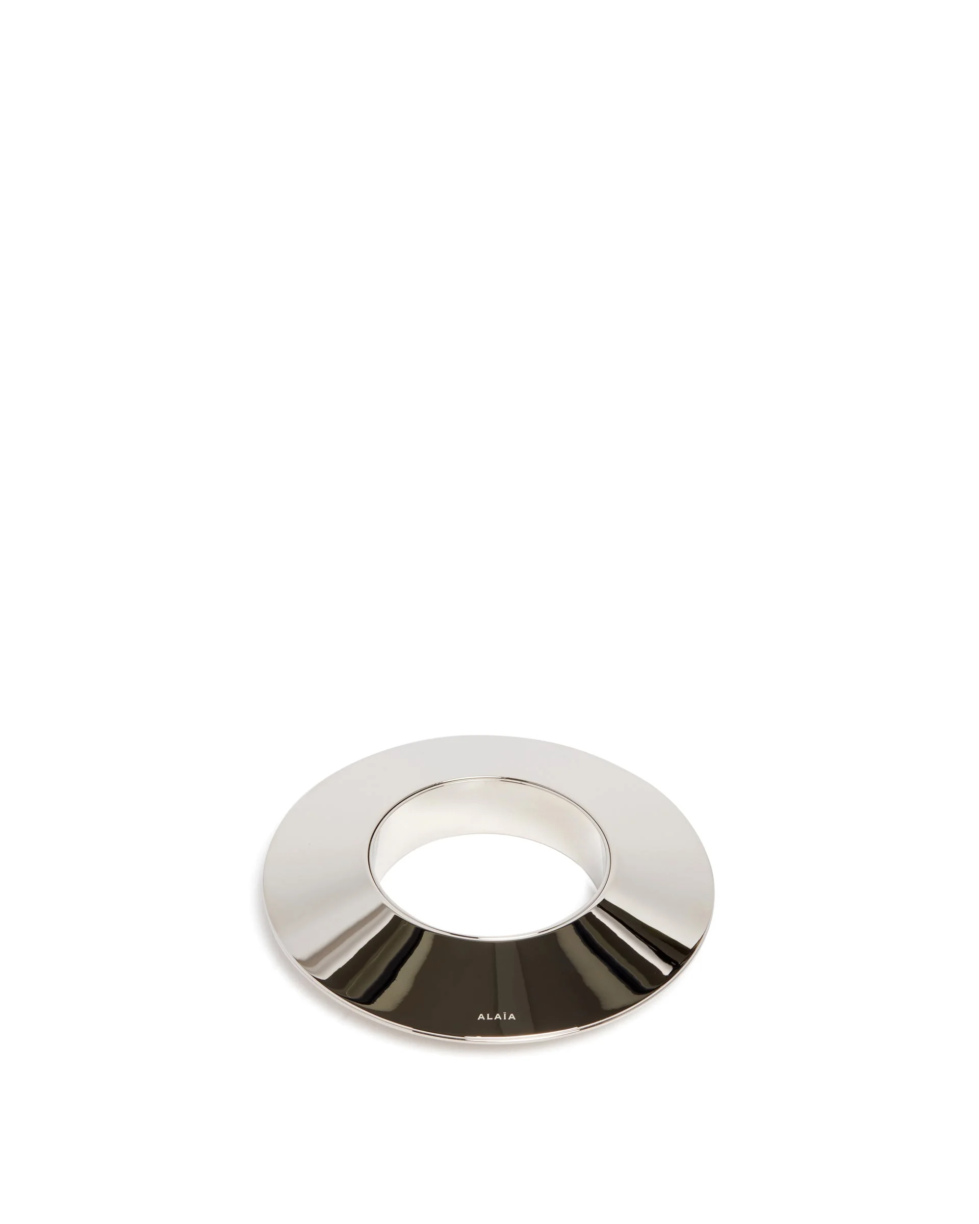 Alaia Silver Blade Cuff Bracelet. Silver-finish brass, rigid bracelet features a sculptural design with a tapered disc silhouette and sharp edges. Logo detail. DETAILS Model: AAJB1002E005210 Composition: 100% Brass Made in: ITALY Season: FW25-26