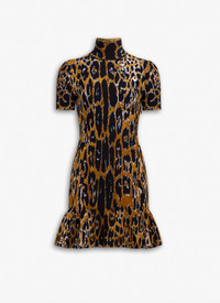 Skater dress in leopard jacquard knit High neck Short sleeves Figure-hugging Voluminous lower hem Knitted in a fine viscose wool blend Made in Italy DETAILS COMPOSITION: 36% VISCOSE, 35% POLYAMIDE, 27% WOOL, 1% POLYURETHANE, 1% ELASTANE PRODUCT REFERENCE: AA9R25096M901 - 968