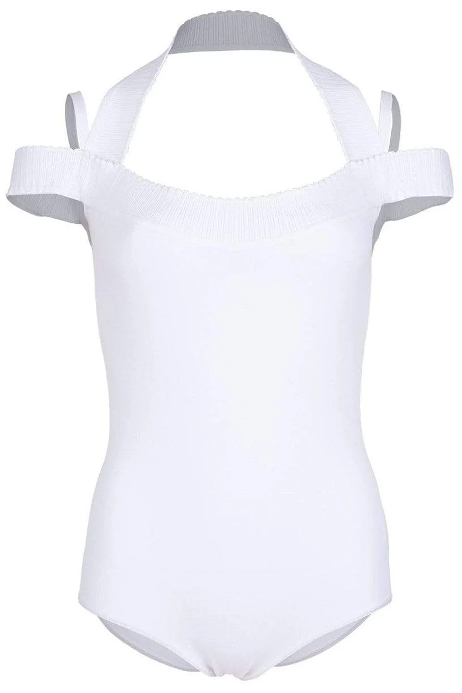 DETAILS AND INSIGHT Alaia white sleeveless bodysuit with a flattering body conscious silhouette and off the shoulder design with halter neck detail. 83% Viscose, 17% Polyester, Dry Clean Made in Italy, French Sizing Style AA9B0105RM035-1