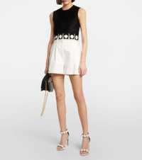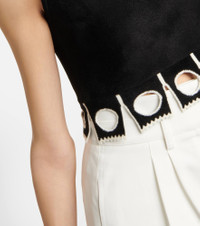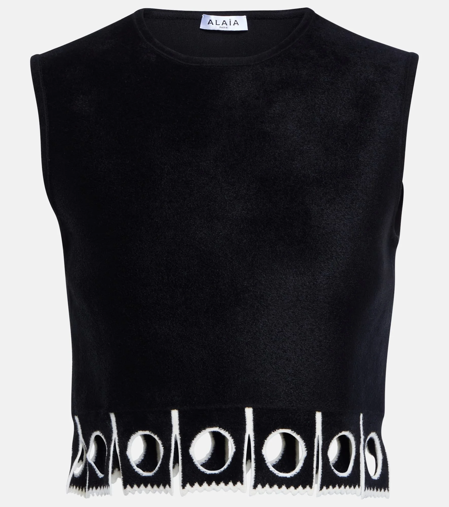 This cropped top from Alaïa is a chic sleeveless style. It’s made in Italy from wool-blend material and finished with thick fringe details with circular cutouts along the hem. Product Details - Made in Italy - Designer color name: Noir/ Blanc - Care instructions: dry clean - Material II: 37% viscose, 1% elastane, 39% polyamide, 23% wool - Material: 2% elastane, 28% viscose, 6% polyester, 23% polyamide, 41% wool - Item number: P00746834 Size & Fit - Fits small to size - we recommend trying one size larger - Cinched waist - Mid-weight material - Cropped - The model seen in the picture is 178cm-5'10" and wearing a size FR 38