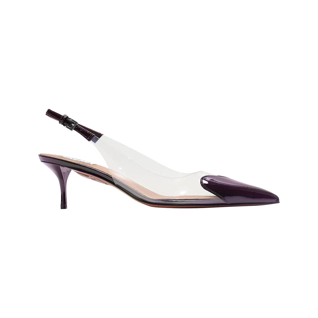600082619DPU036 / PS26-AA3E057CK150/00/413 - Patent calfskin leather construction - Transparent PVC upper panels - Pointed toe silhouette - 55mm kitten heel - Adjustable slingback strap with buckle closure - Leather sole - Slim heel profile ALAIA Slingbacks 55 Patent Calfskin deliver refined elegance with sophisticated French craftsmanship and iconic design. Crafted from premium patent calfskin leather in deep burgundy with transparent PVC panels, featuring the signature pointed toe and kitten heel silhouette. The adjustable slingback strap and luxurious patent finish create a timeless statement piece for contemporary wardrobes.