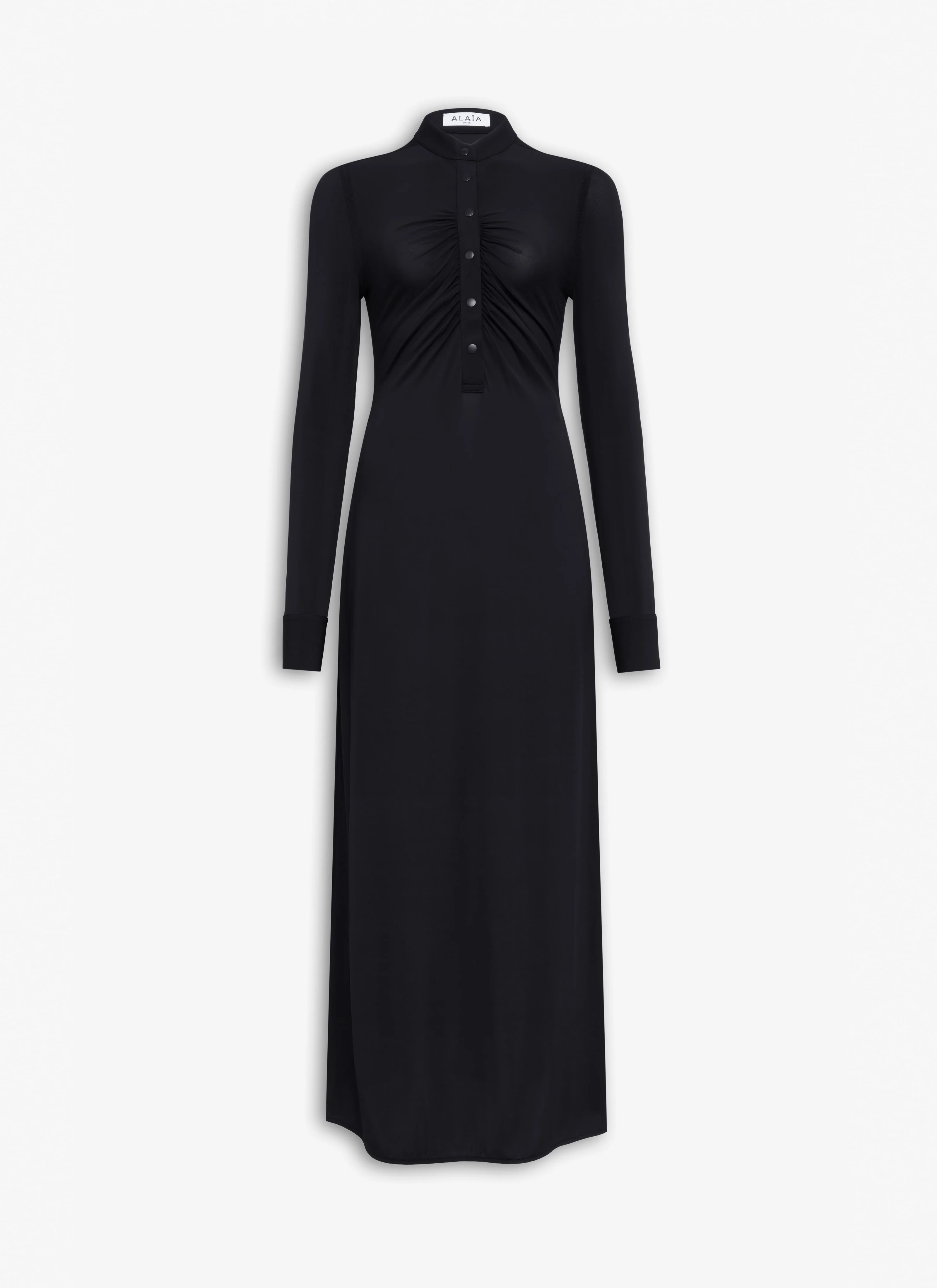 Bodycon ruched dress in soft jersey Maxi length, long sleeved with buttoned cuffs, band collar Front snap closure with ruching detail all along the button flap Body-hugging fit Made in italy DETAILS MAIN MATERIAL : 96% VISCOSE 4% ELASTANE PRODUCT REFERENCE : AA9R2740J050B - 995