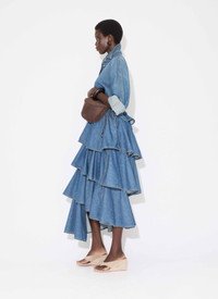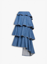 Asymmetrical spiral skirt in fine deep stone denim Low waist, midi length, contrasted tobacco-coloured topstitching details Continuous ruffle band arranged around the skirt in a spiral shape Fluid fit Made in Italy DETAILS MAIN MATERIAL : 100% COTTON PRODUCT REFERENCE : AA9J2358D004B - 505
