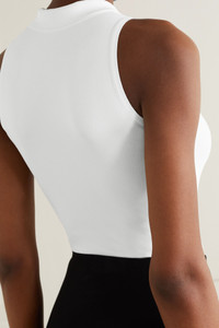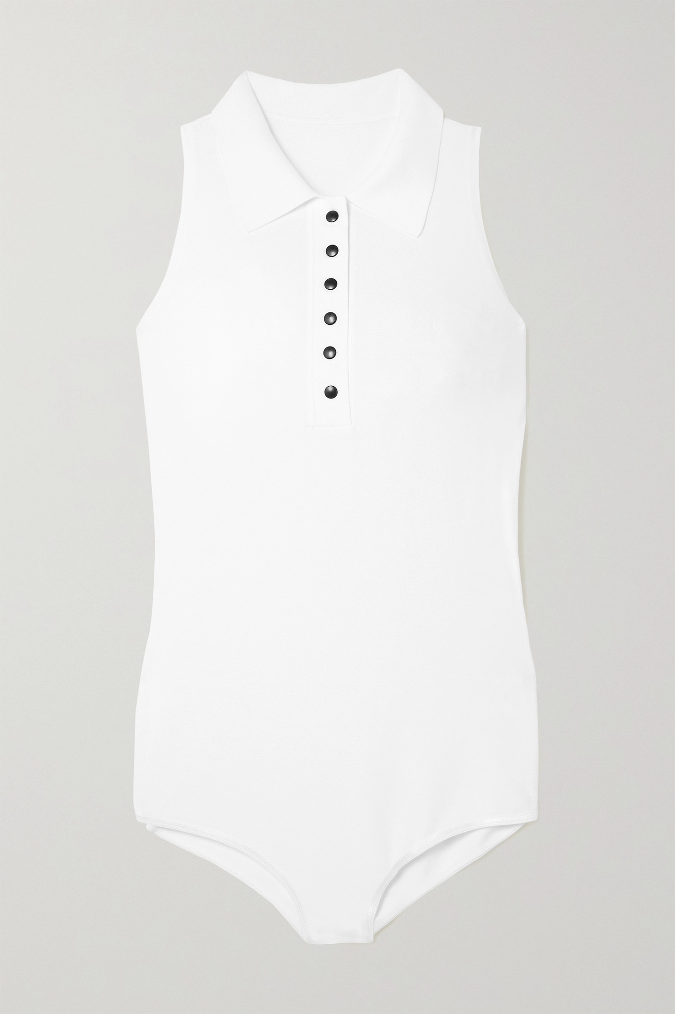 EDITORS'NOTES The right bodysuit can form the foundation of so many outfits, and Alaïa's one is pretty perfect. Made from comfortable stretch-knit, it has a polo collar and snap fastenings along the front. Team yours with everything from slouchy jeans to mini skirts. SIZE & FIT - Fits true to size, take your normal size - Designed for a close fit - Lightweight knit - Model is 180cm/ 5’11” and is wearing a FR 36 DETAILS & CARE - White stretch-knit - Snap fastenings at front and base - 83% viscose, 17% polyester - Dry clean - Made in Italy