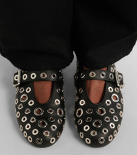 Upholding the legacy of Azzedine Alaia, the maison’s collections achieve an artful balance between sculptural and wearable. Crafted from leather, these ballet flats boast buckle-fastening straps on the uppers and all-over stud embellishments. Product Details - Upper: leather - Lining: leather - Sole: leather insole, rubber sole - Color: black - Toe shape: round toe - Made in Italy - Includes: dust bag, shoe box - Designer color name: Noir - Hardware color: silver - Closure: buckle fastening - Item number: P01130191 Size & Fit - True to size - European sizes