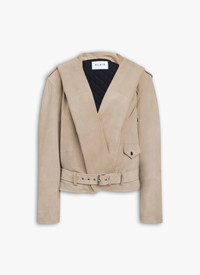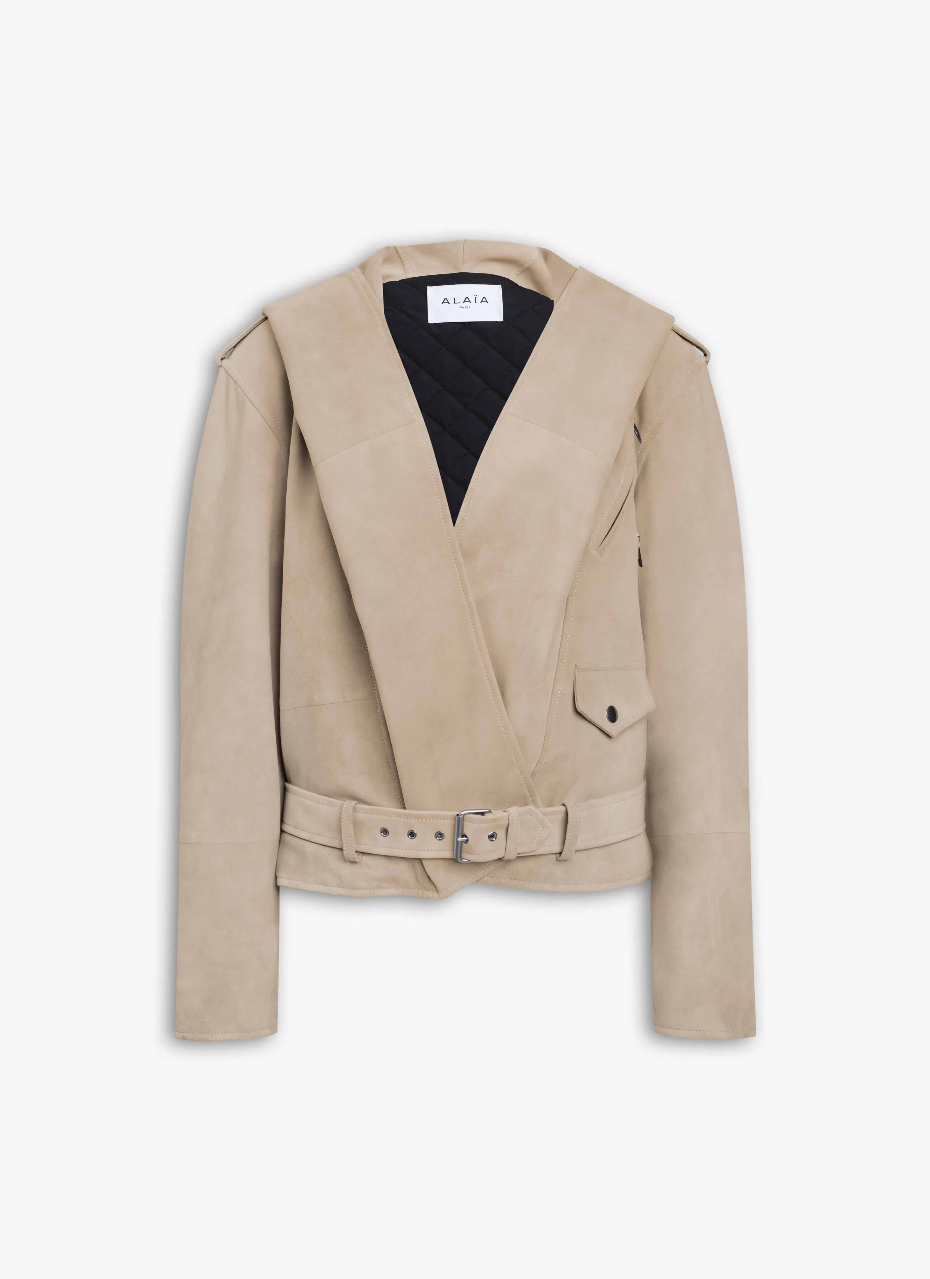 Hooded biker jacket in goat suede Full-coverage hood, shawl collar, integrated belt, zipped pockets Relaxed fit Made in Italy DETAILS MAIN MATERIAL : 100% GOATSKIN LEATHER PRODUCT REFERENCE : AA9V0428L017B - 120