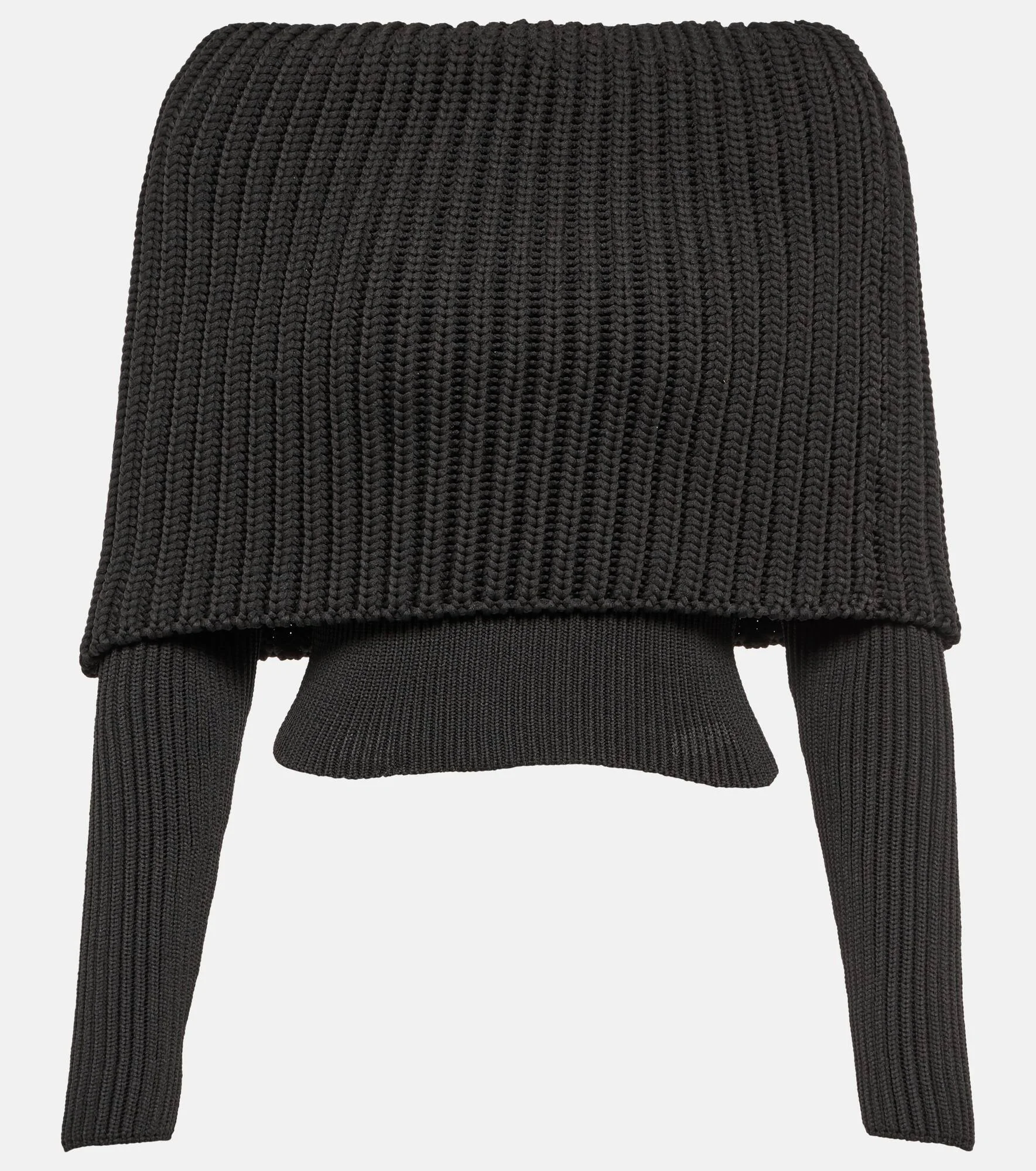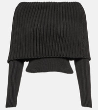 This sweater from Alaïa is knitted in fisherman's rib stitches. It has a fitted silhouette and a fold-over, off-shoulder neckline. - material: 100% polypropylene - care instructions: dry clean - Made in Italy - Designer colour name: Noir Alaia - Runs small, please see Size & Fit tab size & fit - Fits small to size - we recommend trying one size larger - Straight fit - Heavy material - Cropped - The model seen in the picture is 178cm-5'10" and wearing a size FR 38