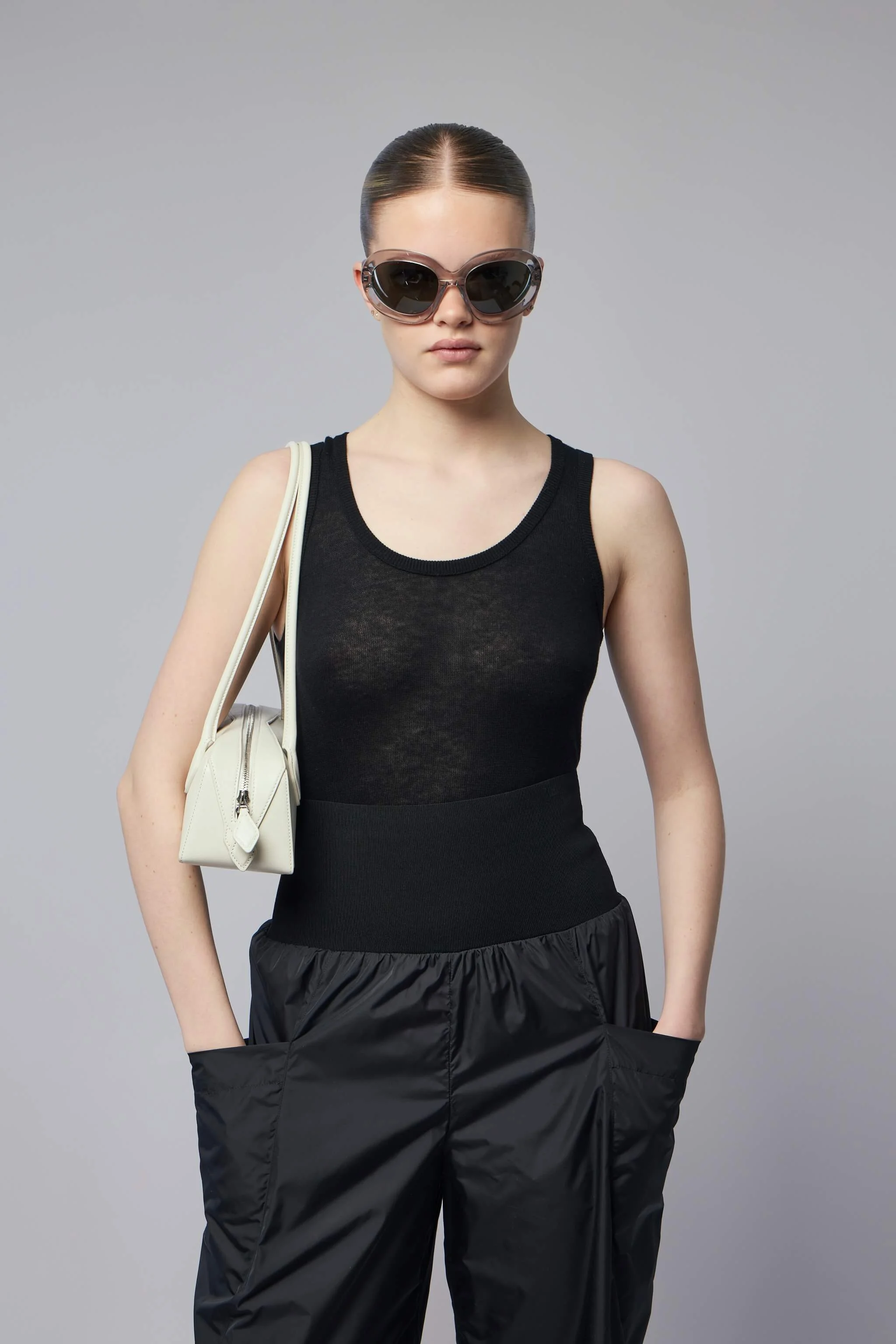 SKU: 153497 Brand style: AA9H1384K132C Tank top in a fitted design, featuring a ribbed neckline and arm openings. The lightweight fabric provides a sleek silhouette. - Sleeveless design - Ribbed neckline - Fitted silhouette - Semi-sheer material - Solid color Materials: 97% Wool, 2% Polyamide, 1% Elastane Color: Noir Alaia The model is 1.79m (5.9ft) and wears a size FR36. The item fits very tightly, similar to activewear or shapewear. It's often designed for performance or a body-hugging style.