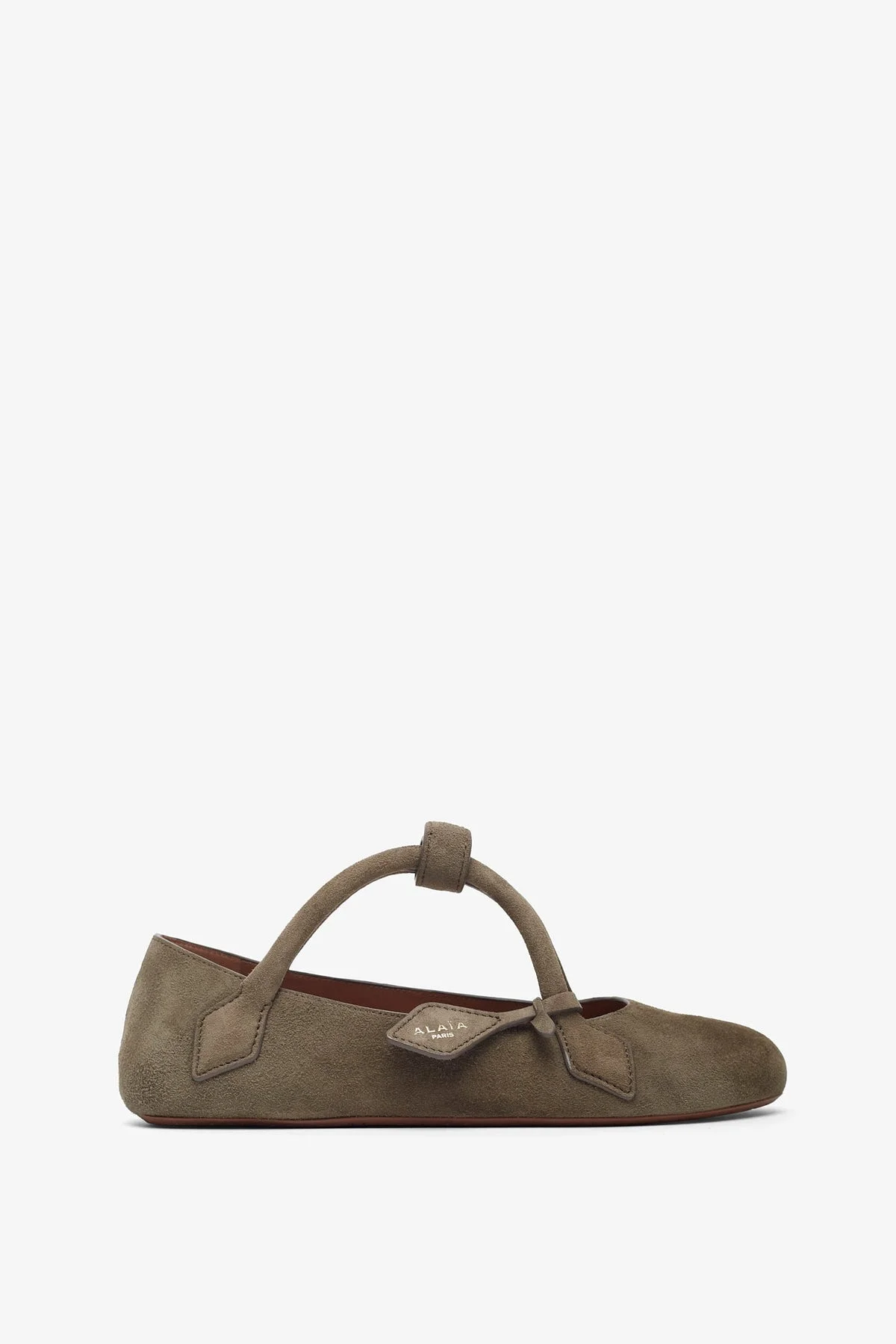 Grey suede ballet flats from Alaia. The Teckel suede ballet flats are made of suede, featuring elongated straps across the top of the shoe and the Alaia tag, playing with the signature details of Le Teckel bag. - Rubber sole - True to size - Made in Italy Product Code: AA3A1011C0C05809