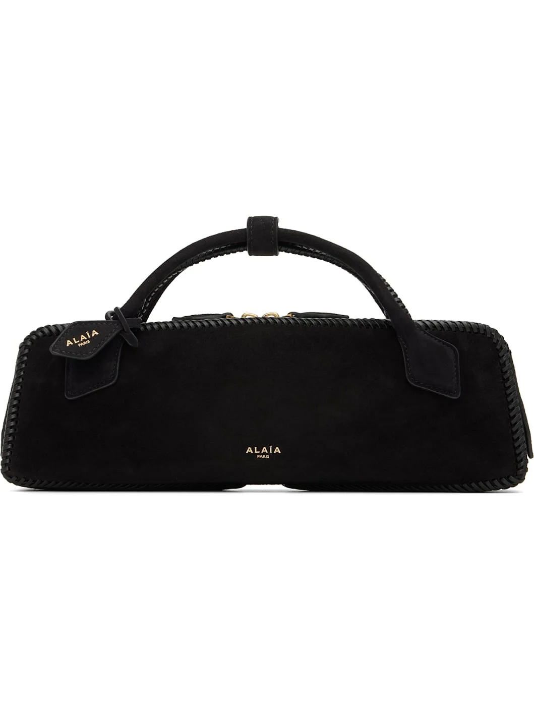 Suede top handle bag. · Whipstitching throughout · Press-stud tab at rolled carry handles · Detachable logo tag · Logo stamp at face · Two-way zip closure · Card slot and detachable mirror at interior · Suede lining · H4" x W12" x D2.5" Supplier color: Noir Leather. Made in Italy 252483F046010