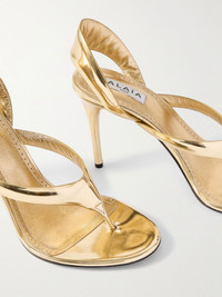 Alaia’s ‘Tong’ sandals were styled with multiple outfits on the label’s Spring ’25 runway, proving just how versatile they can be. They’re made from gold mirrored-leather with flip flop-inspired straps and rest on 90mm stiletto heels. Size & Fit - Fits true to size, take your normal size - Only available in full sizes, go up to the nearest whole size if you take a half size - Italian sizing Details & Care - Heel measures approximately 90mm/ 3.5 inches - Gold mirrored-leather (Lamb) - Slip on
