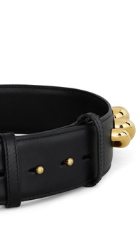 DETAILS Thin belt with teardrop shaped brass jewel elements on the side Subtle fastening in the back Calf leather Width : 3,5 cm Made in Italy MATERIALS Highlights MAIN MATERIAL:100% CALF LEATHER SECONDARY MATERIAL:100% BRASS PRODUCT REFERENCE: AA1C2002I170-999