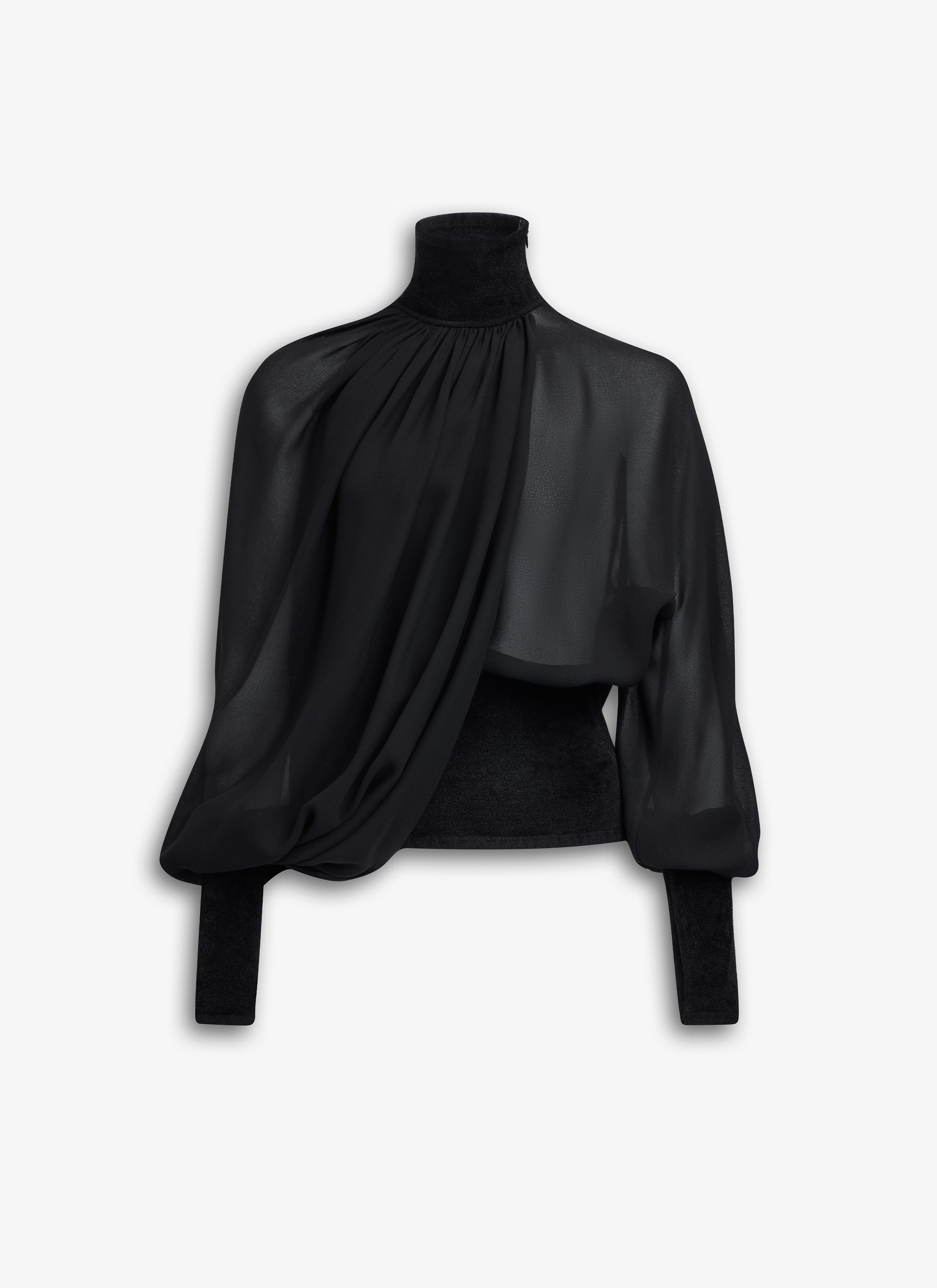 Draped light georgette blouse Asymmetrical cut High neck, long sleeves, cinched waist and cuffs Made in Italy DETAILS COMPOSITION: 100% VISCOSEBORD RIBBING: 59% VISCOSE, 40% POLYAMIDE, 1% ELASTANE PRODUCT REFERENCE: AA9H0491T666A - 995