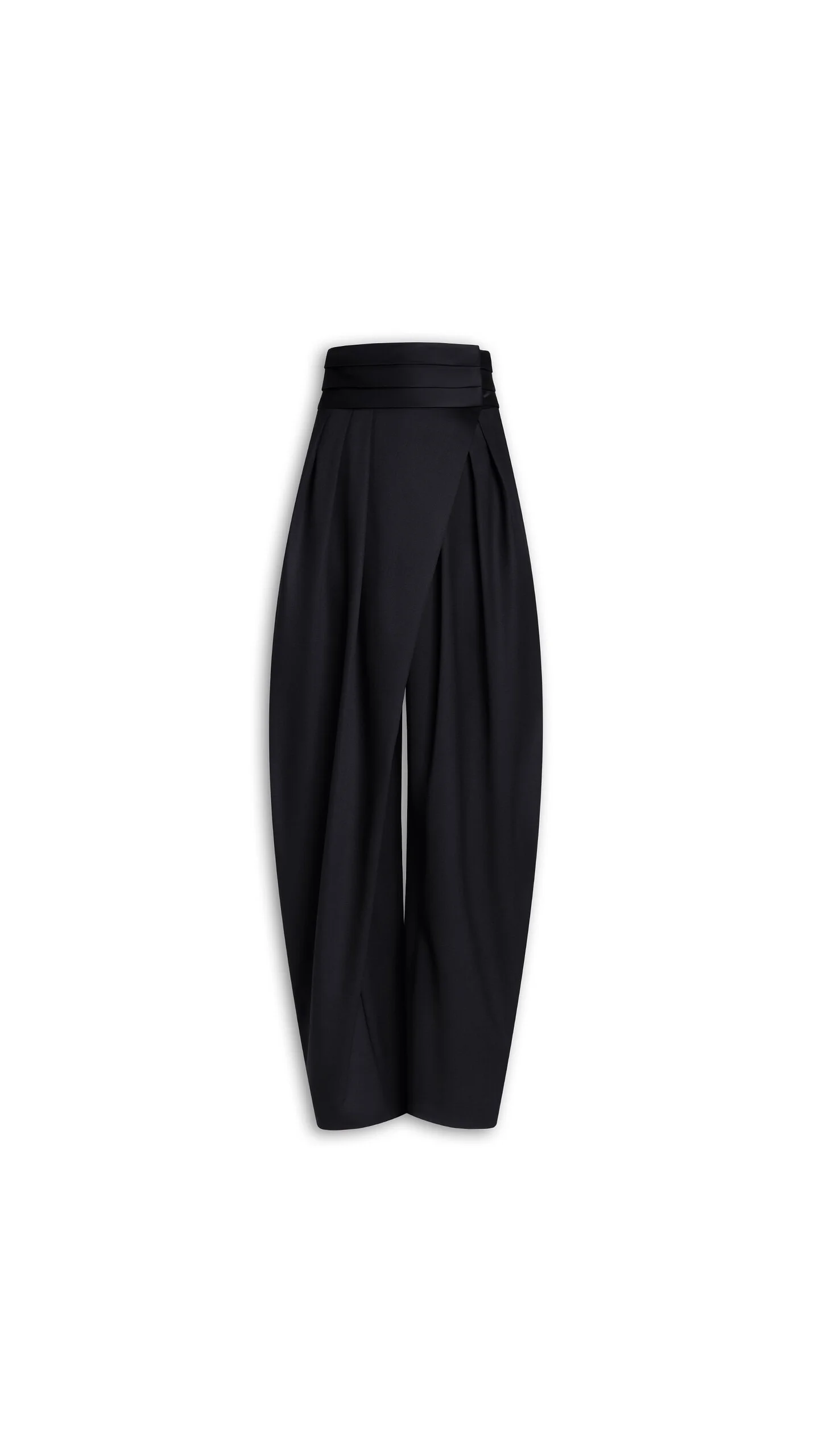 DETAILS Tuxedo wrap pants in grain de poudre Tailored fit, barrel leg, silk waistband Side seam pockets Made in Italy MATERIALS Highlights MAIN MATERIAL: 98% VIRGIN WOOL, 2% ELASTANE WAISTBAND: 100% SILK POCKET LINING: 100% COTTON PRODUCT REFERENCE: AA9P1292T615C-995