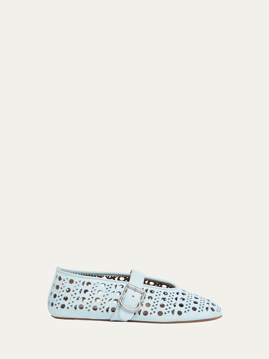 ALAIA "Vinne" lasercut perforated suede ballerina flats Round toe Mary Jane buckle strap Rubber outsole Lining: Leather Made in Italy