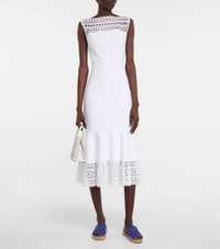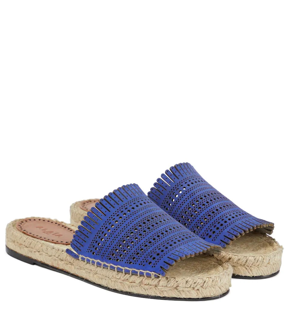 Alaïa is renowned for intricate laser-cut designs such as the Vienne pattern. These flat slider sandals rest on espadrille-inspired braided jute soles and have meticulously worked suede uppers that are tipped with short fringes. Product Details - Toe shape: round open toe - Lining: leather - Upper: goat leather, calf leather - Made in Spain - Designer color name: Bleu Indigo - Item number: P00635001 Size & Fit - True to size - Half sizes please take the next size down - European sizes - 2,5cm-1" platform (size EU 38)