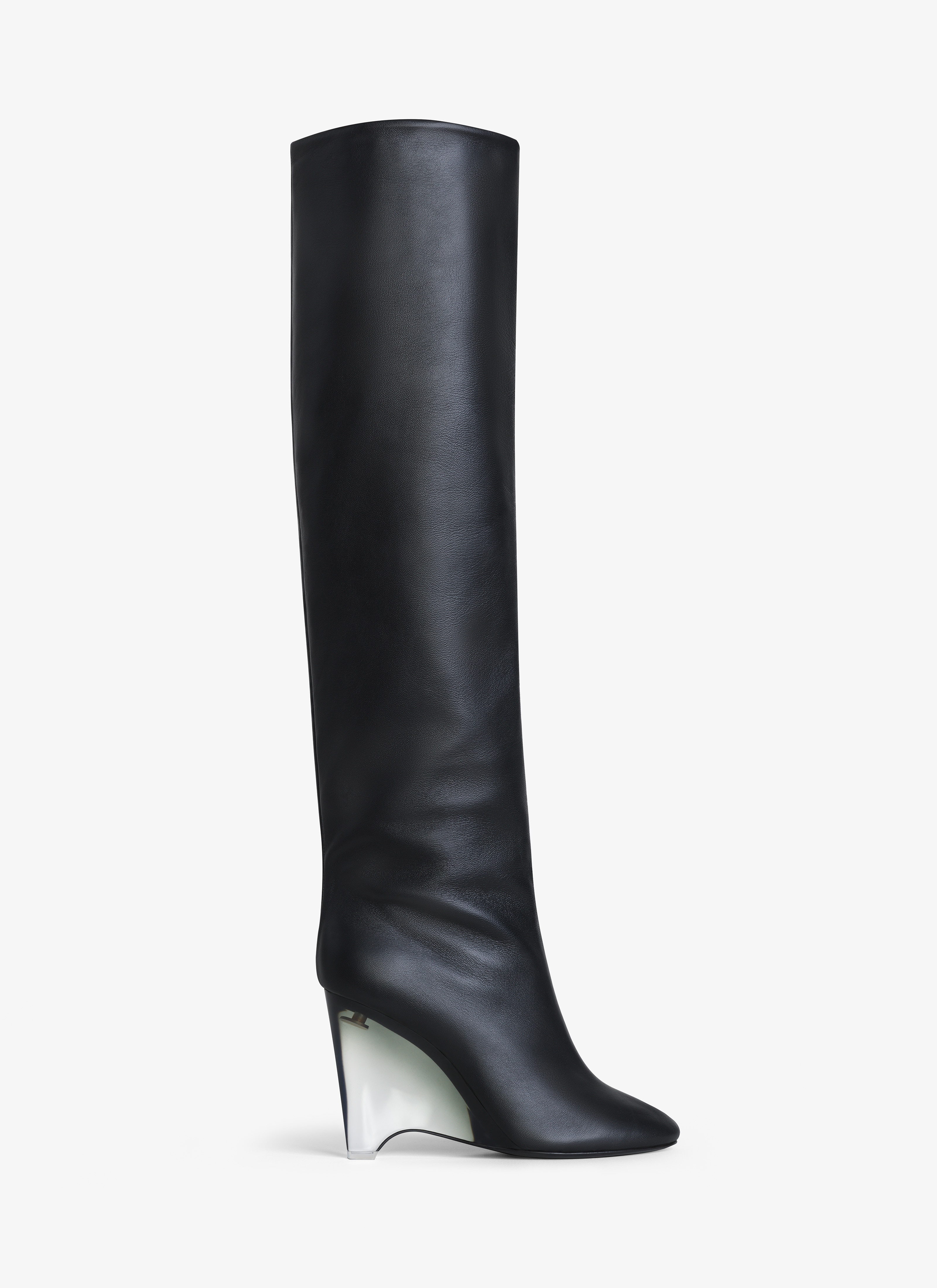 wedge boots mouted on a degrade plexi structure slip on over the knee height made in italy DETAILS COMPOSITION: 100% LAMBSKIN SOLE: 95% CALFSKIN, 5% RUBBER HEEL: 10CM, 100% POLYMETHYL METHACRYLATE PRODUCT REFERENCE: AA3O053C0N04 - 999
