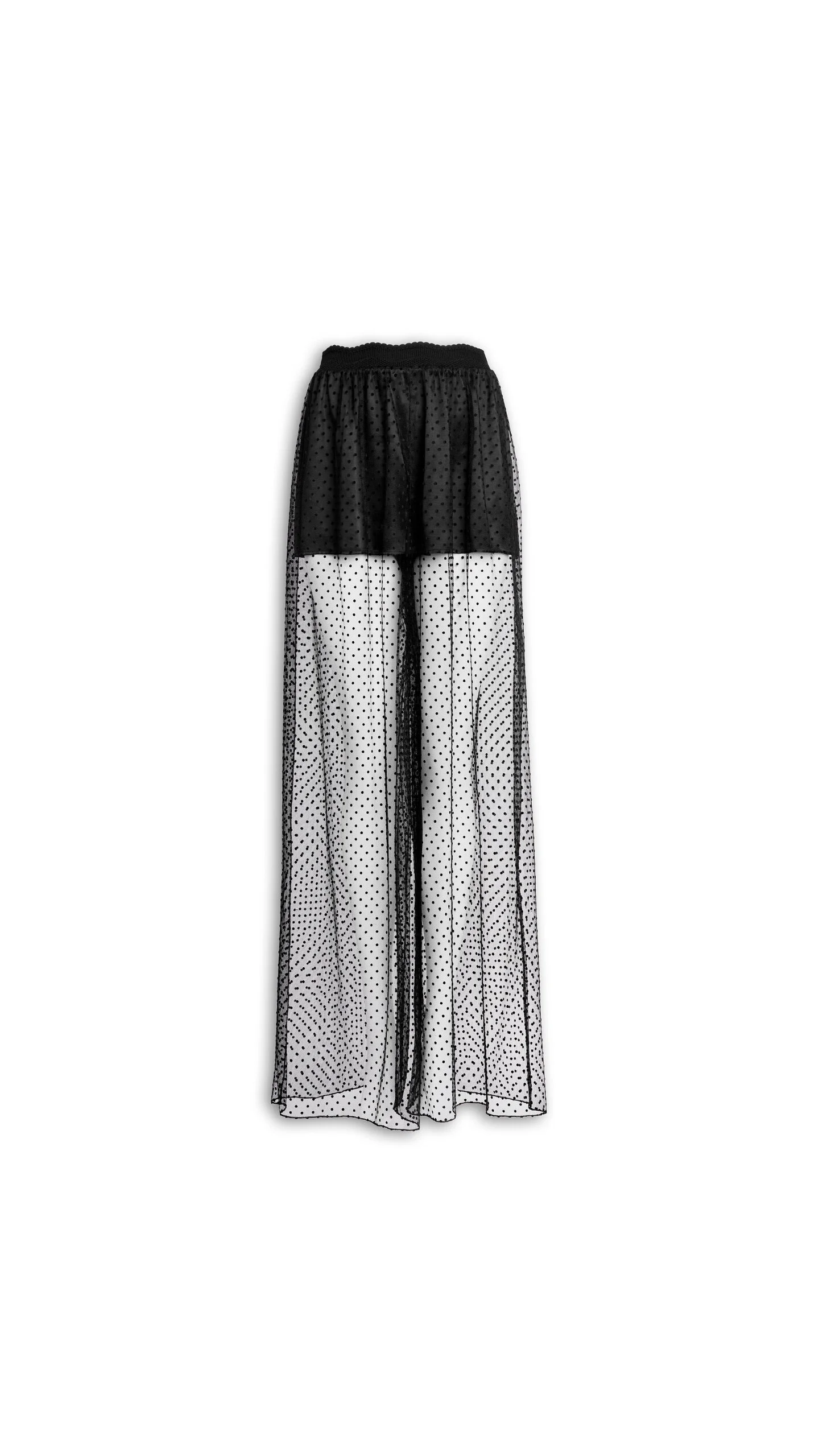 DETAILS Wide leg fluid pants in plumetis mesh Mid rise with elasticated waist band Integrated opaque short lining Made in Italy MATERIALS Highlights MAIN MATERIAL: 93% NYLON, 7% VISCOSE MAIN LINING: 100% SILK WAISTBAND: 98% POLYAMIDE, 2% ELASTANE PRODUCT REFERENCE: AA9P1305W136C995