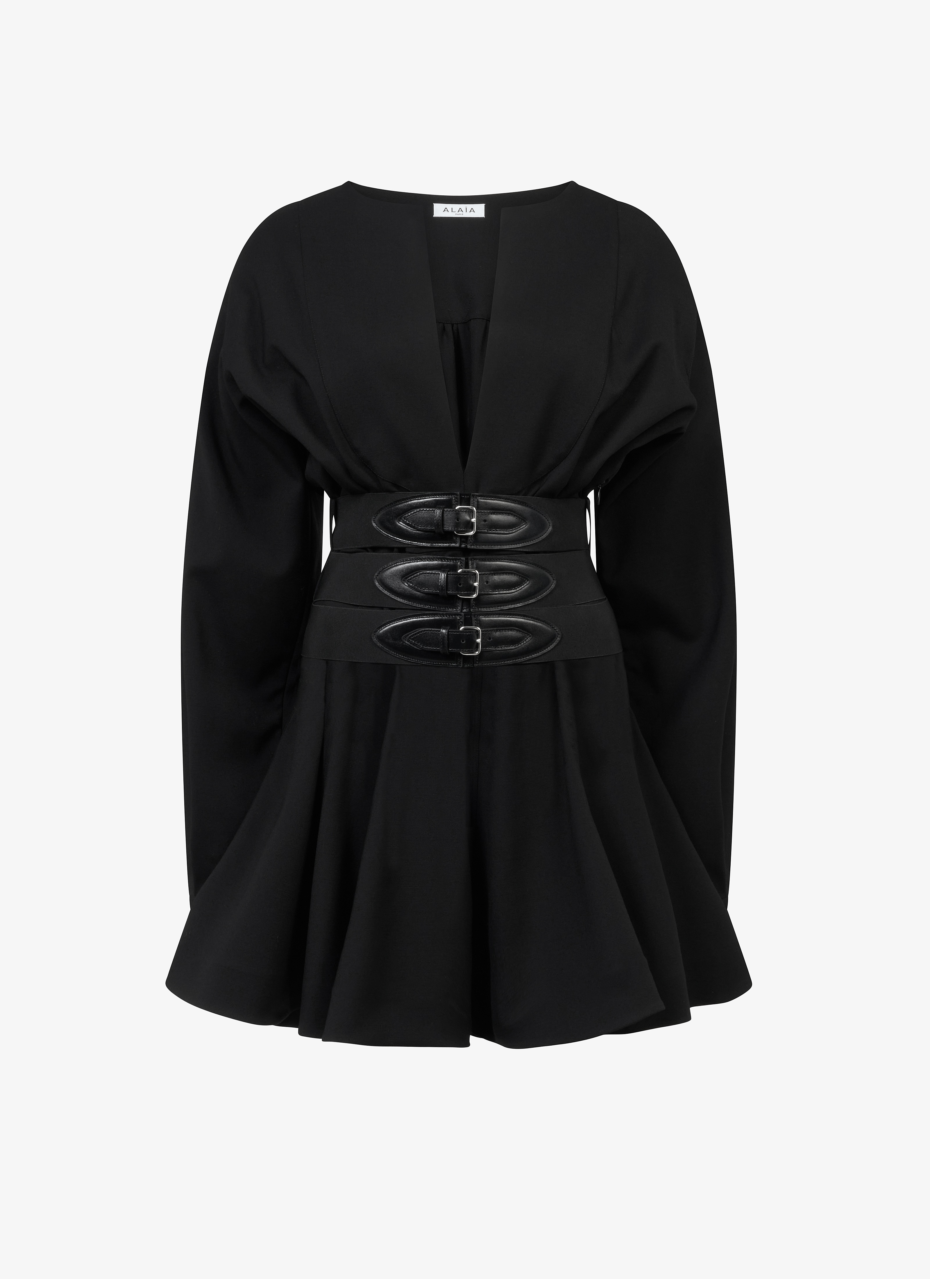 buckle dress short length, long sleeves mao collar with v neckline plastron integrated elastic leather belts hugging the waist and hips flared skirt with fabric gathered by the belts made from stretch wool made in italy DETAILS COMPOSITION: 98% WOOL ADDITIONAL MATERIAL: 2% ELASTANE THE MODEL MEASURES 1m77 AND WEARS A SIZE 36 PRODUCT REFERENCE: AA9R12354T471 - 995