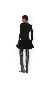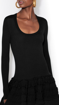 DETAILS Peplum dress in wool crinoline in knit Mini length, scoop neckline, long sleeves Slim fit, flare ruffle hem Made in Italy MATERIALS Highlights MAIN MATERIAL: 97% WOOL, 2% POLYAMIDE, 1% ELASTANE SLEEVE: 92% WOOL, 6% POLYAMIDE, 2% ELASTANE COLLAR: 88% WOOL, 9% POLYAMIDE, 3% ELASTANE PRODUCT REFERENCE: AA9R2867K164C-995