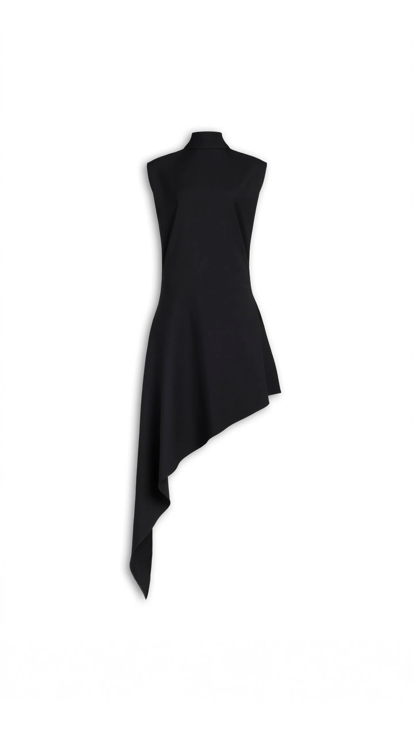 DETAILS Pointed dress in wool gabardine Funnel neckline, sleeveless, asymmetrical hemline Shorter in the back, longer in the front Fit & Flare Invisible zip closure at the back Made in Italy MATERIALS MAIN MATERIAL: 98% SHEEP WOOL, 2% ELASTANE POCKET LINING: 73% ACETATE FIBRE, 27% SILK PRODUCT REFERENCE: AA9R3047T471C-995