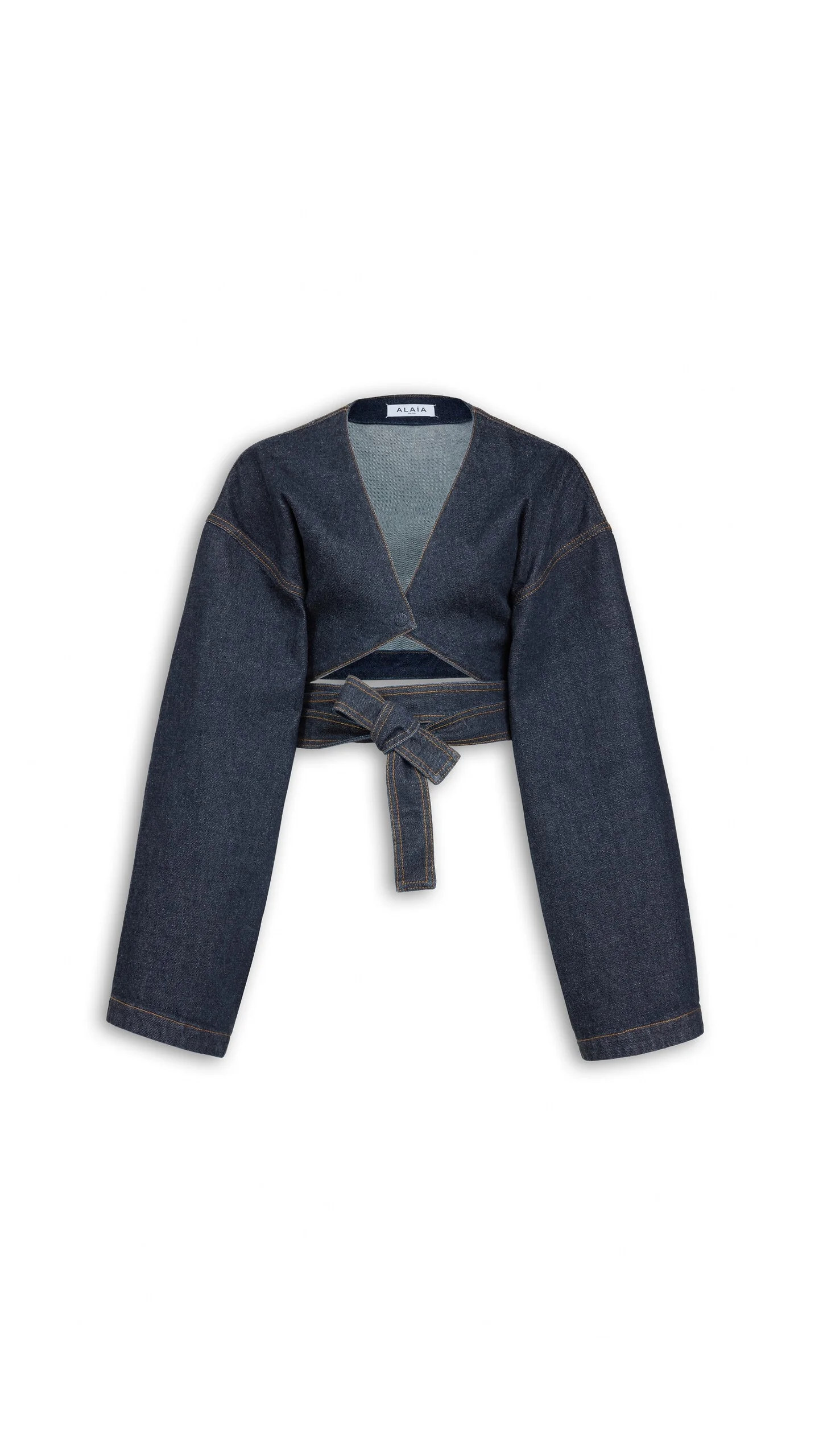 DETAILS Cropped jacket in raw denim V-collar, drop sleeves, wrap belt, bust cut-out Made in Italy MATERIALS MAIN MATERIAL: 99% COTTON, 1% POLYURETHANE PRODUCT REFERENCE: AA9V1286D008C-A08