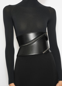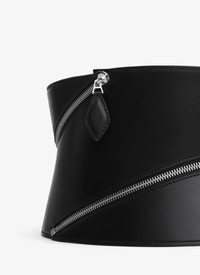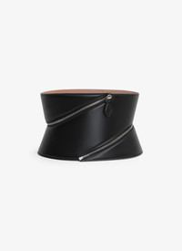 Corset belt adorned with contrasted spiral zip A signature Alaia accessory shaped to adjust the waist perfectly Calfskin leather Dimensions (cm) : H 16,5 Made in Italy DETAILS MAIN MATERIAL: 100% CALF LEATHER MAIN LINING: 100% CALF LEATHER PRODUCT REFERENCE: AA1C038GCA339 - 999