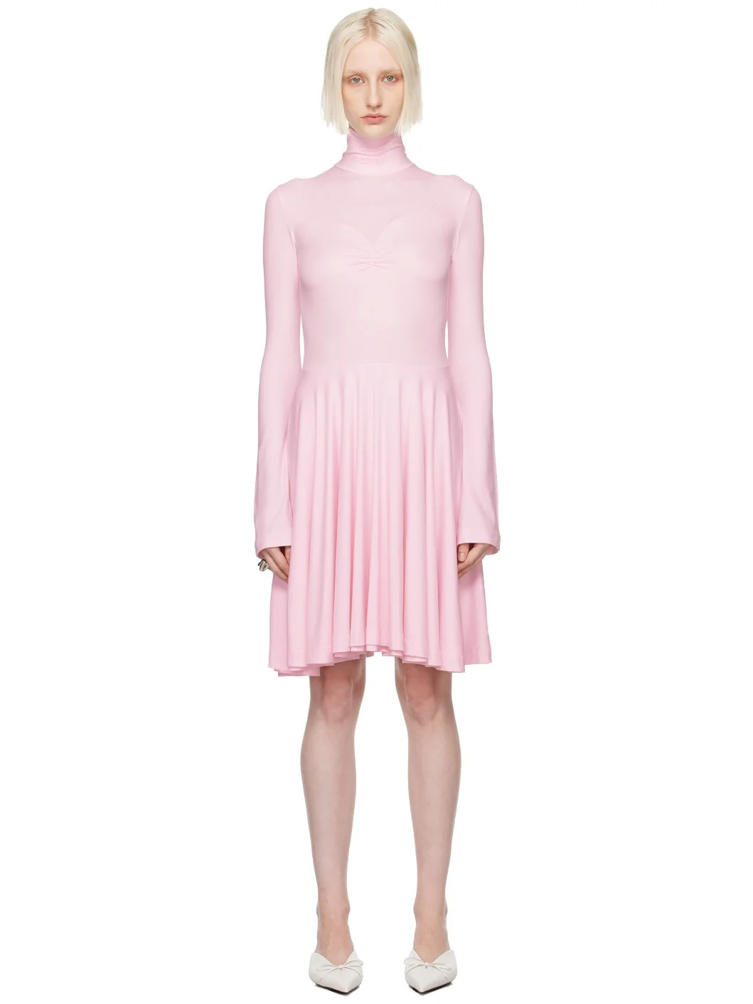 Stretch cupro jersey dress. · Logo embroidered at turtleneck · Ruching at bust · Ruffles at layered hem · Zip closure at back Supplier color: Pink 94% cupro, 6% elastane. Made in Portugal 242288F052002